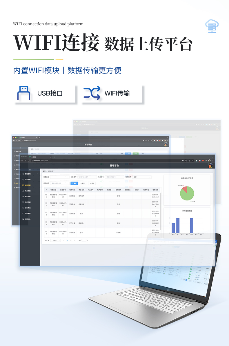 8.3、數據監管系統:同步對接監管平臺,數據可局域網和互聯網數據上傳,檢測結果可選擇直接傳至食品安全監管平臺。進行區域食品安全監管及大數據分析處理與數據統計,檢測區域食品安全長短期動態,達到食品安全問題預估、預警。