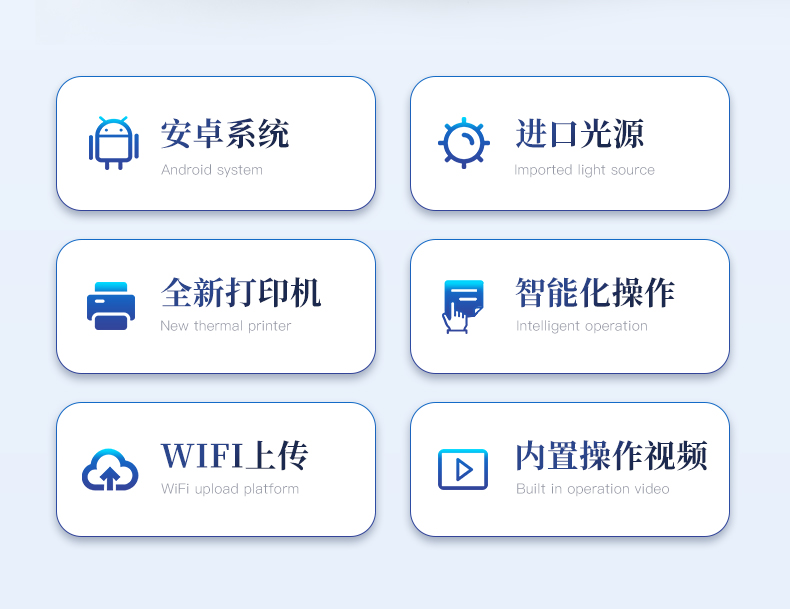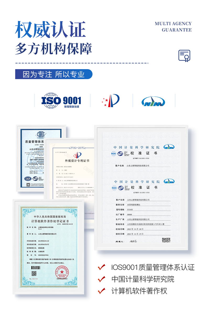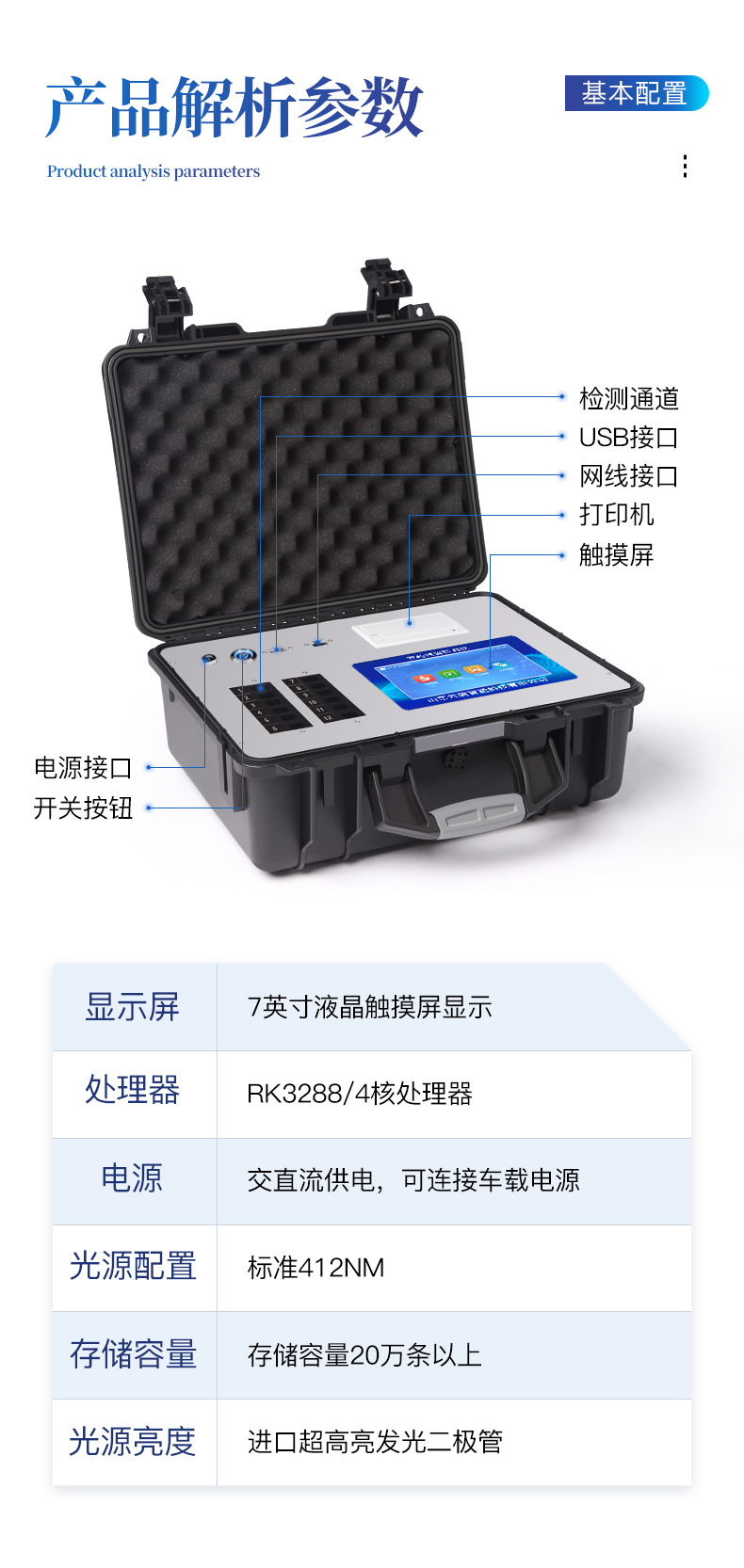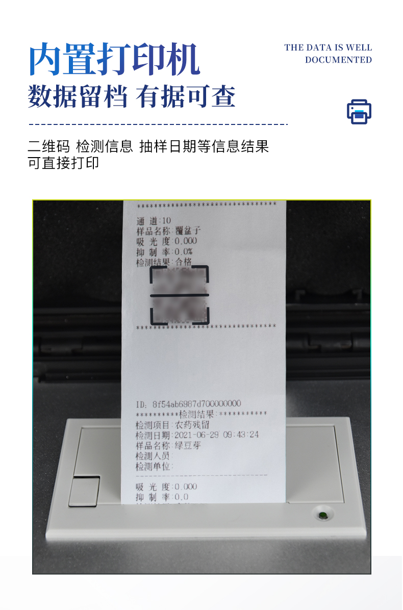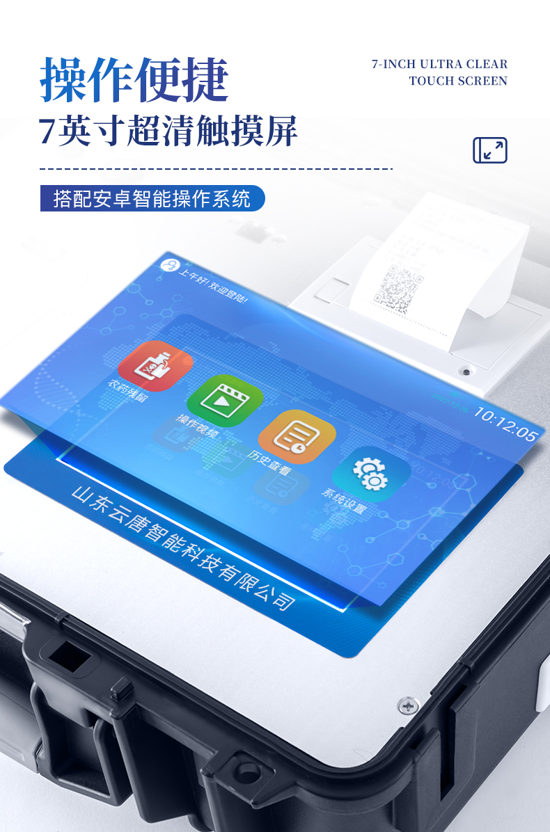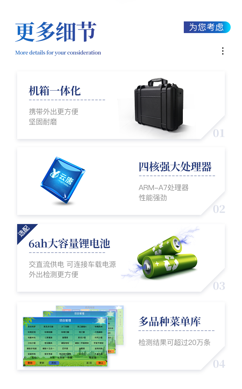 | 機箱采用工業(yè)級ABS工程塑料箱,方便攜帶,穩(wěn)固耐用,便于流動測試。 | 智能操作系統(tǒng),采用更加人性化操作,主控采用多核處理器,主頻1.88Ghz,運轉(zhuǎn)速度更快速,穩(wěn)定性更強。 | 自動判斷樣品是否合格,檢測結(jié)果更加直觀。 | 儀器具有100多種蔬菜名稱菜單庫,分類管理,并可按需添加或刪除蔬菜名,編輯蔬菜名稱,可直接打印出蔬菜名稱。 | 檢測通道:6個檢測通道,可以同時測試多個樣品,循環(huán)檢測,即放即檢,每個樣品由程序控制分別獨立工作,不會互相干擾。 | 儀器具有wifi聯(lián)網(wǎng)功能,可將數(shù)據(jù)快速上傳電腦,進行數(shù)據(jù)管理與統(tǒng)計,4G信號GPRS遠傳功能,可插手機卡實現(xiàn)數(shù)據(jù)遠傳平臺,。 | 顯示方式:7英寸高靈敏真彩觸摸屏顯示,人性化中文操作界面,讀數(shù)直觀、簡單。 | 打印機采用串口5v打印,可選擇手動打印或者自動打印,三分鐘出打印結(jié)果,打印格式為檢測人姓名、吸光度差值、檢測時間、檢測機構(gòu)、樣品名稱及結(jié)果判定。 | 光源采用進口超高亮發(fā)光二極管,具有低功耗、高精度、穩(wěn)定性強、光源可控可以關(guān)掉不使用的光源,響應(yīng)速度快等優(yōu)點。 | 智能恒流穩(wěn)壓,光強自動校準(zhǔn),長時間連續(xù)工作光源無溫漂現(xiàn)象。 | 采用USB2.0接口設(shè)計,方便數(shù)據(jù)的存貯和移動,并可隨時與計算機直接相連,并且可用計算機控制儀器。實現(xiàn)數(shù)據(jù)查詢、瀏覽、分析、統(tǒng)計、打印等。 | 智能化程度高,儀器具有自檢功能:具有開機自檢和調(diào)零功能,具有自動檢測重復(fù)性功能 | 儀器具有自身保護功能,可設(shè)置用戶名及密碼,防止非工作人員操作等。 | 采用DC12v直流供電,安全系統(tǒng)更高,并且配備6A鋰電池充電器。 | 儀器具有重新校準(zhǔn)、鎖定、恢復(fù)出廠設(shè)置功能。 |