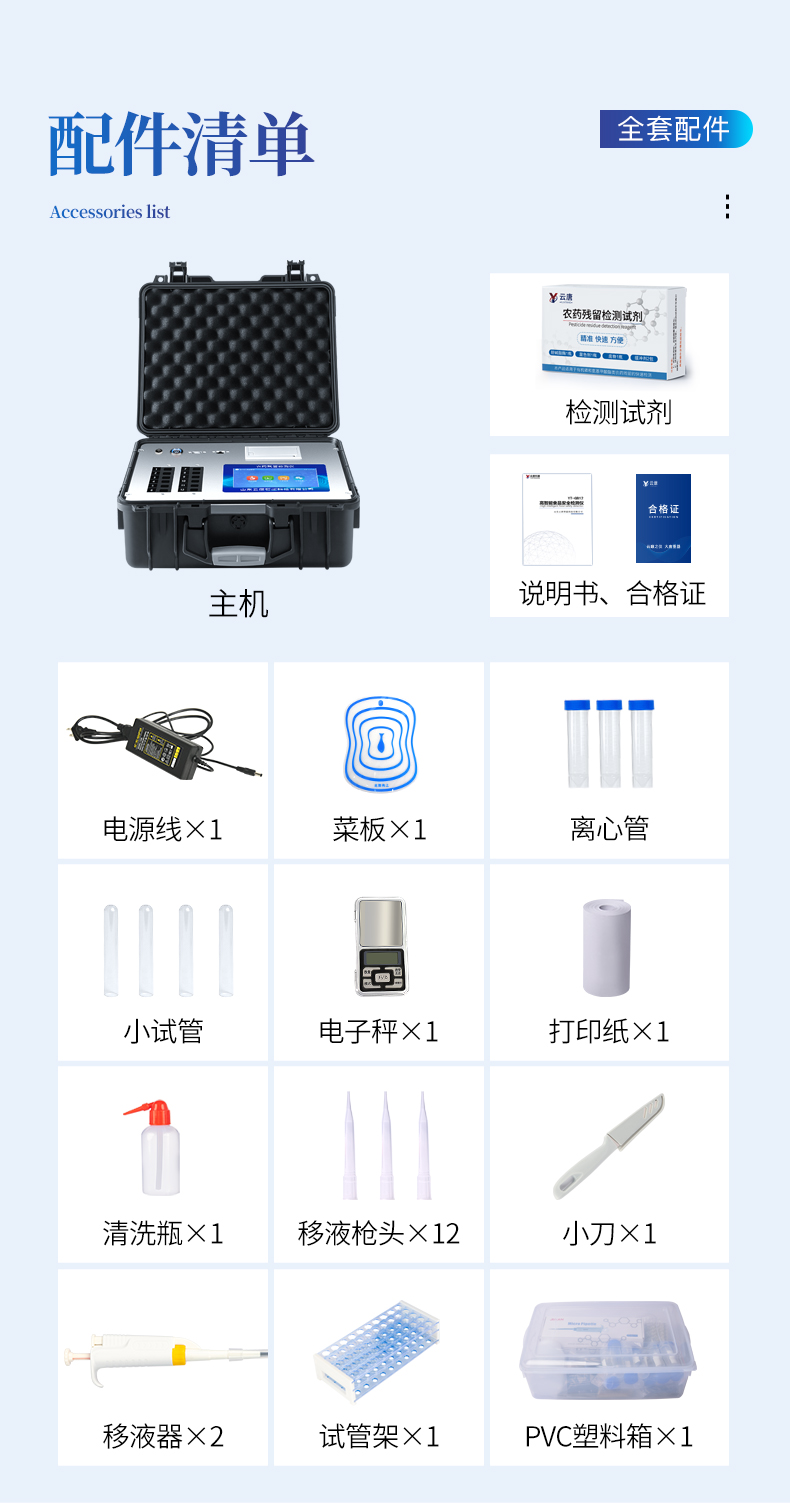 檢測標(biāo)準(zhǔn):依據(jù)國家標(biāo)準(zhǔn)方法(GB/T5009.199-2003)以及世界衛(wèi)生組織WHO、世界糧農(nóng)組織FAO殘留農(nóng)藥檢測標(biāo)準(zhǔn)、世界環(huán)境保護局EPA參照攝入量等要求來設(shè)計。采用酶抑制率比色法對水果、蔬菜等農(nóng)林產(chǎn)品中有機磷和氨基甲酸酯類農(nóng)藥含量進行快速準(zhǔn)確的檢測,乙酰膽堿酯酶和丁酰膽堿酯酶試劑均可以使用,符合國家標(biāo)準(zhǔn)和農(nóng)業(yè)部標(biāo)準(zhǔn)的要求。
