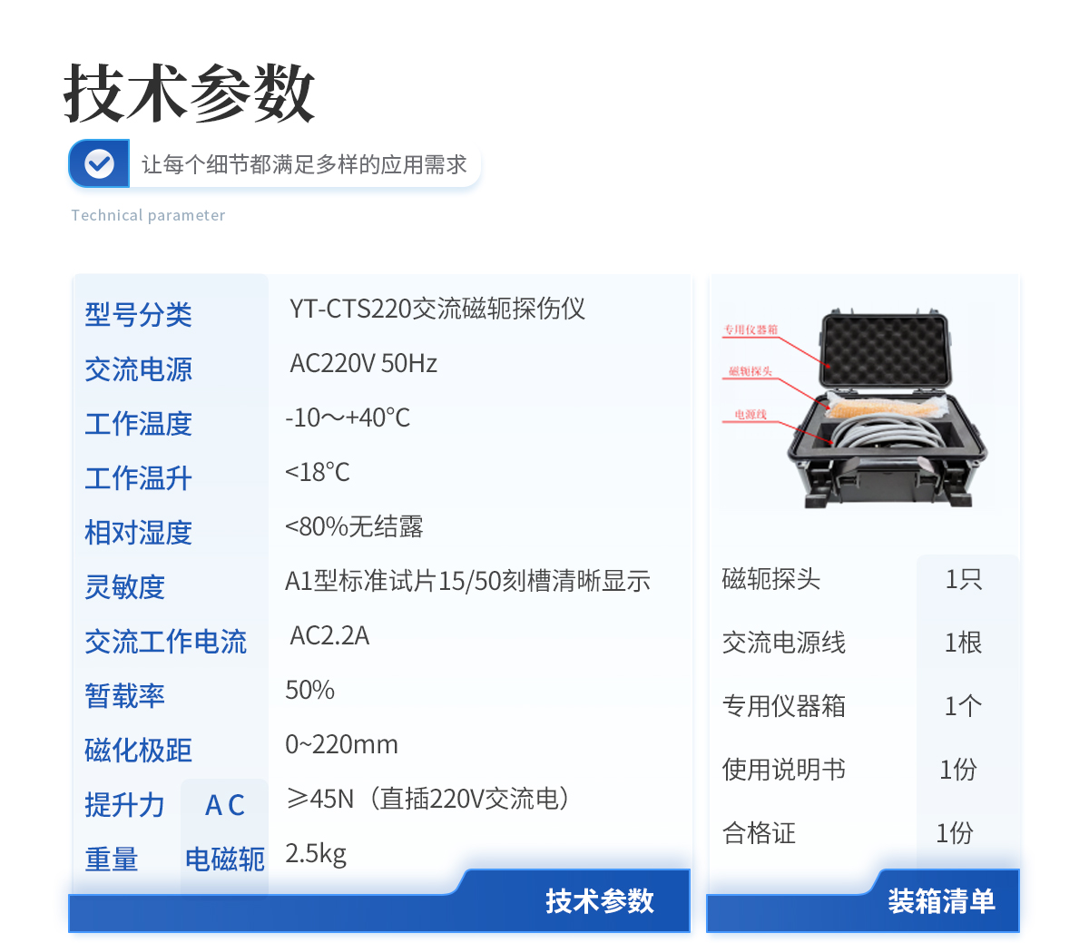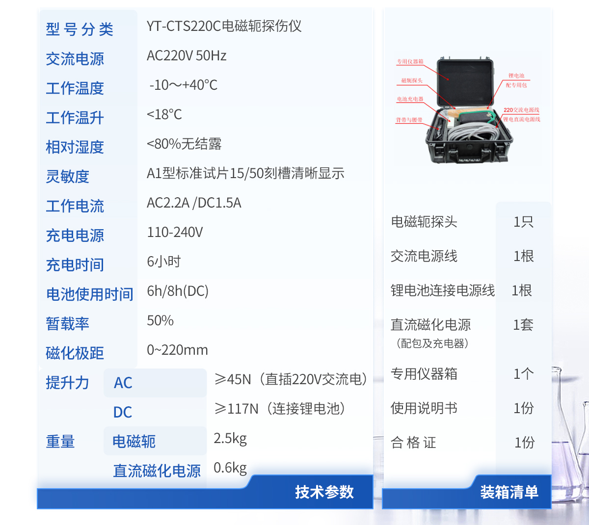 型 號 分 類:YT-CTS-N型電磁軛探傷儀交流電源:AC220V 50Hz工作溫度:-10~+40℃工作溫升:<18℃            相對濕度:<80%無結露            靈敏度:A1型標準試片15/50刻槽清晰顯示工作電流:AC2.2A充電電源:110-240V充電時間:約6小時電池使用時間:4h/6h(AC)暫載率:50%磁 化 極 距:0~220mm提升力:A C ≥45N(連接交流鋰電池)重量: