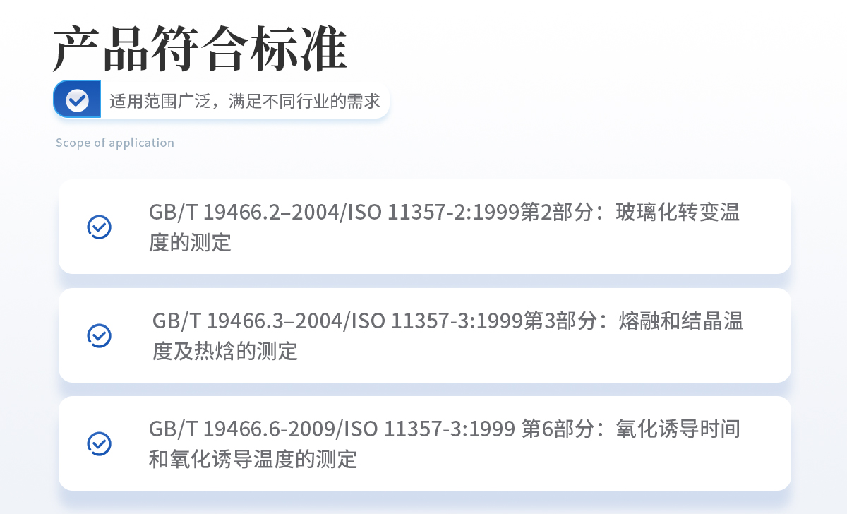GB/T 19466.2–2004/ISO 11357-2:1999第2部分:玻璃化轉(zhuǎn)變溫度的測定 GB/T 19466.3–2004/ISO 11357-3:1999第3部分:熔融和結(jié)晶溫度及熱焓的測定 GB/T 19466.6-2009/ISO 11357-3:1999 第6部分:氧化誘導(dǎo)時(shí)間和氧化誘導(dǎo)溫度的測定
