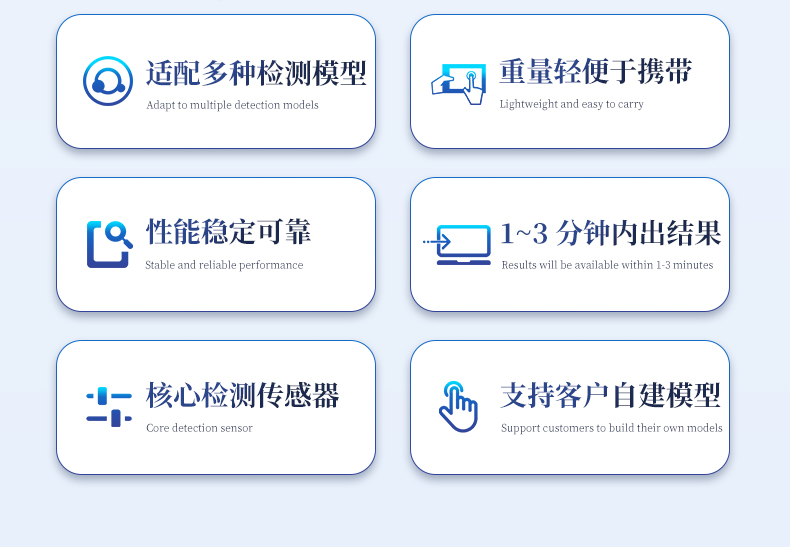 儀器重量輕體積小,既可作為實驗室檢測儀器,又可攜帶到田間地頭、生產一線實現快速檢測。儀器核心采用進口高性能光譜分析系統,具有體積小、性能優、穩定性強等特點,檢測精度達到**同類儀器水平。