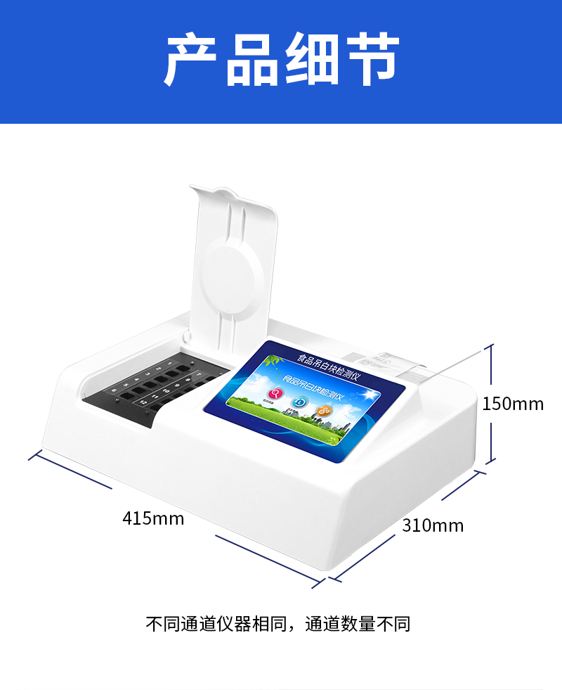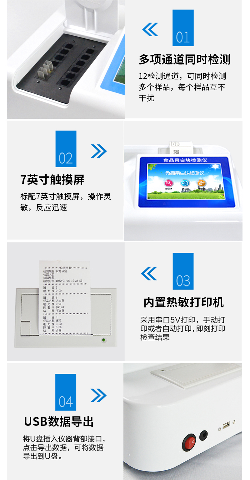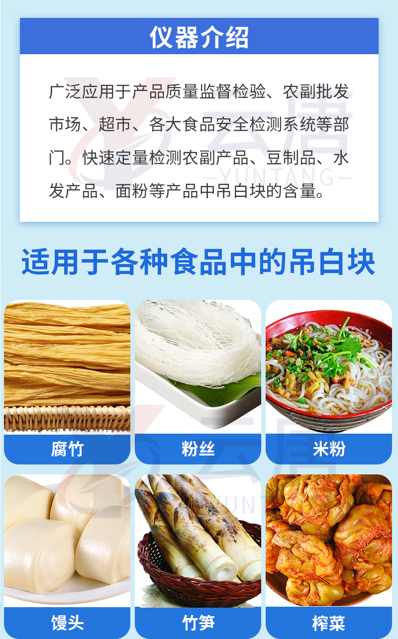 檢測項目:用于快速檢測食品中吊白塊,儀器預留其他項目檢測程序和端口,根據日后需求可方便的自主增加檢測項目。日后可升級為檢測,水產品,肉制品,面制品的綜合類型儀器。