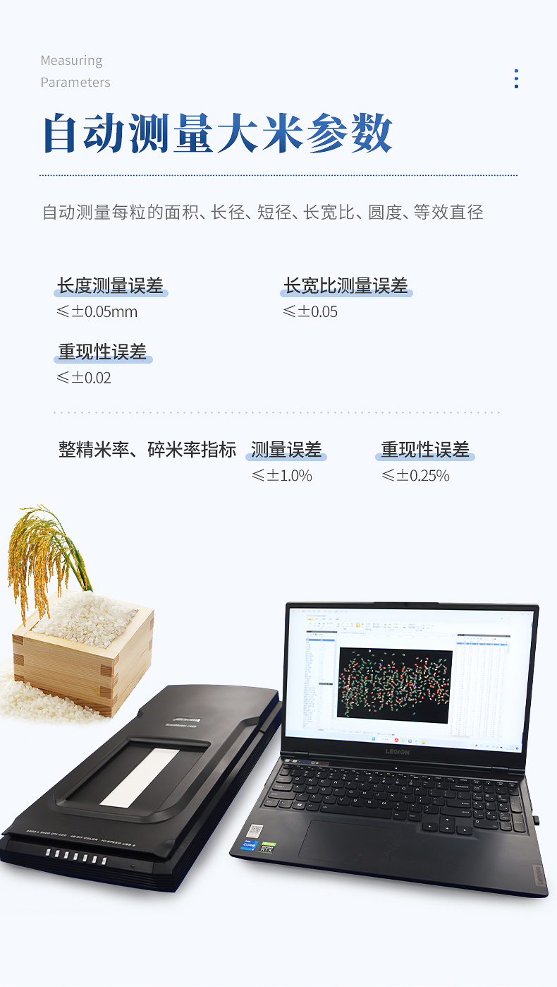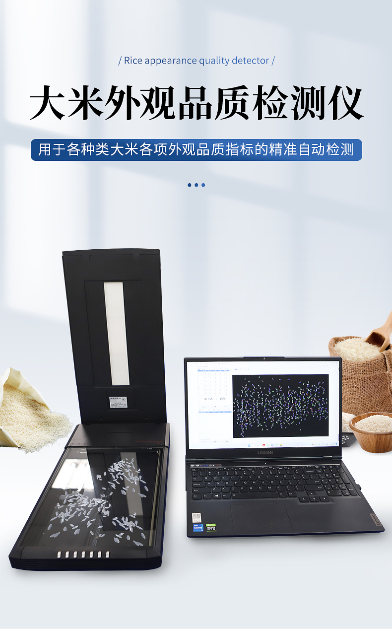 簡介:精準自動檢測各種類大米(粳米、秈米、雜交米、有機米等)精米的外觀品質指標1、★配光學分辨率4800×4800、A4幅面的反射稿掃描儀來彩色成像。2、★符合國標GB/T1350稻谷、GB/T17891優質稻谷或GB1354大米、大米粒型分類判定LS/T6116-2016(如:每粒的長、寬、長寬比、面積等)、糧食行業標準 大米LS/T 3247—2017等標準。可