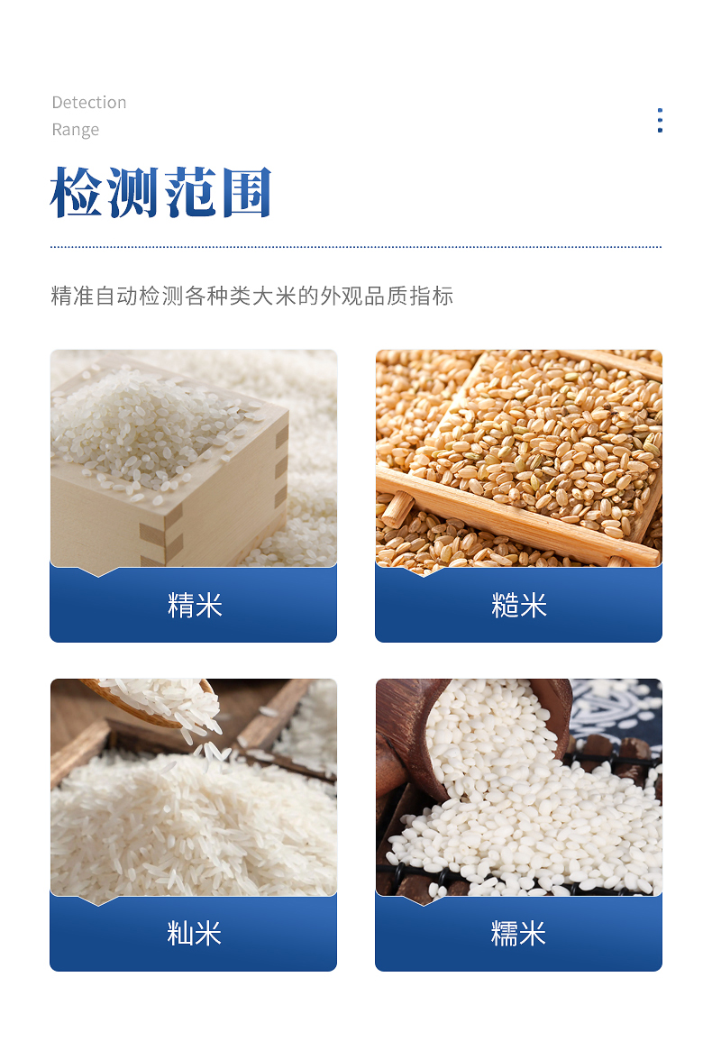 2、★檢測方法完全符合GB/T 5502-2018《糧油檢驗 大米加工精度檢驗》、GB 1354-2018《大米》、GB/T5503-2009《碎米》等相關國家標準。