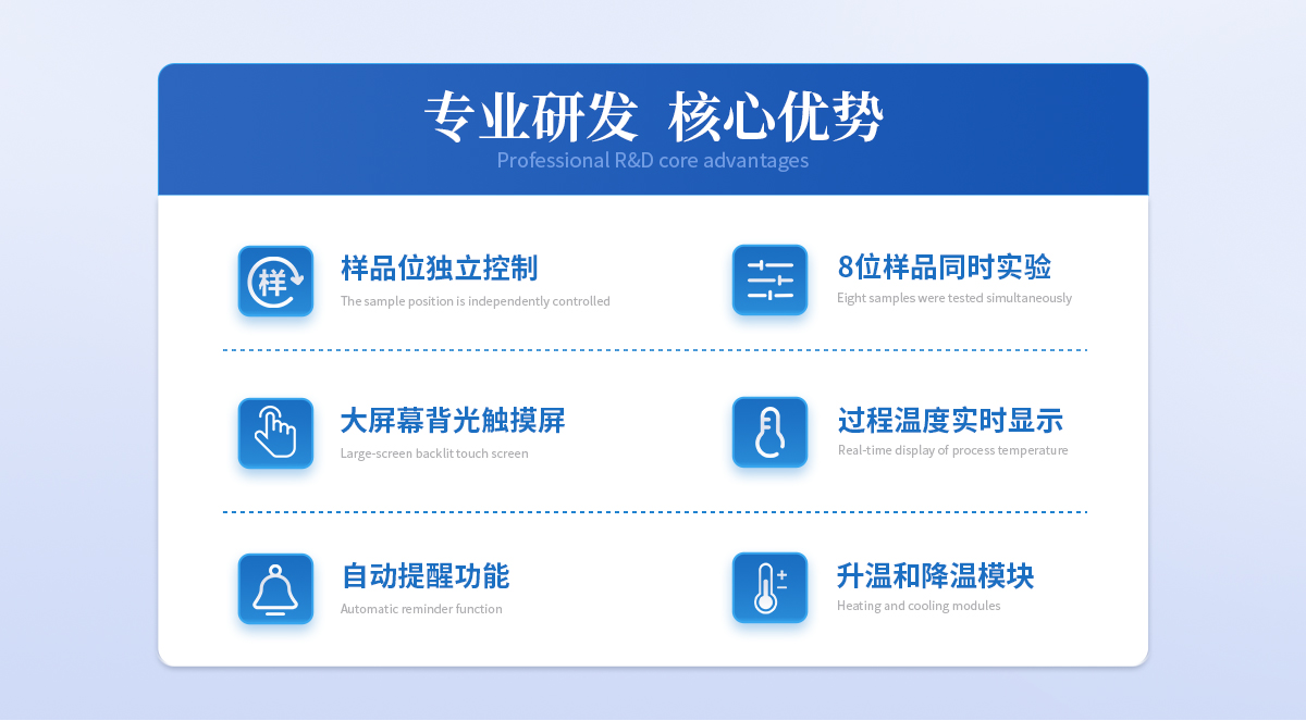 | ◆ 全樣品位:28位, | ◆ 工作站操作系統:通過上位機工作站軟件控制測定的具體操作,準確直觀。并能對硬件實時監測,出錯后實時顯示錯誤碼。測量結果可以Excel輸出或另存,并且不同批的樣品標識不同顏色。 | ◆ 樣品位可獨立控制:每個樣品位獨立控制,*多實現28位樣品同時實驗;每次可根據情況確定樣品數量,可對本批次樣品分組或備注。并可隨時添加樣品,添加樣品后,不影響原樣品的測定時間。 | ◆ 恒溫控制功能:**的升溫和降溫模塊,自動控制實驗操作在恒溫下進行,實驗過程溫度實時顯示。 | ◆ 控溫精度:25℃±2℃ | ◆ 測量提醒功能:到達檢測條件后自動提醒功能,保證每次實驗的及時進行。 | ◆ 數據自動顯示 :測量結果隨時查詢,并可查詢所有以前測過的數據。 |
