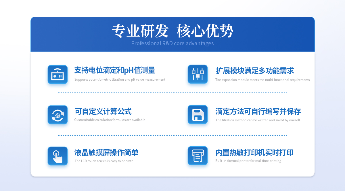 | 自動電位滴定儀是一種用于化學分析的精密儀器,他通過自動添加滴定劑來確定樣品中特定成分的濃度。該儀器基于電位滴定原理工作,即根據在滴定過程中電池電動勢的變化來確定滴定終點的一款滴定設備。設備滿足國家檢定規程JJG 814-2015《自動電位滴定儀》儀器級別中的0.05級別,即儀器**示值誤差為±1.5%,儀器示值重復性≤0.2% |