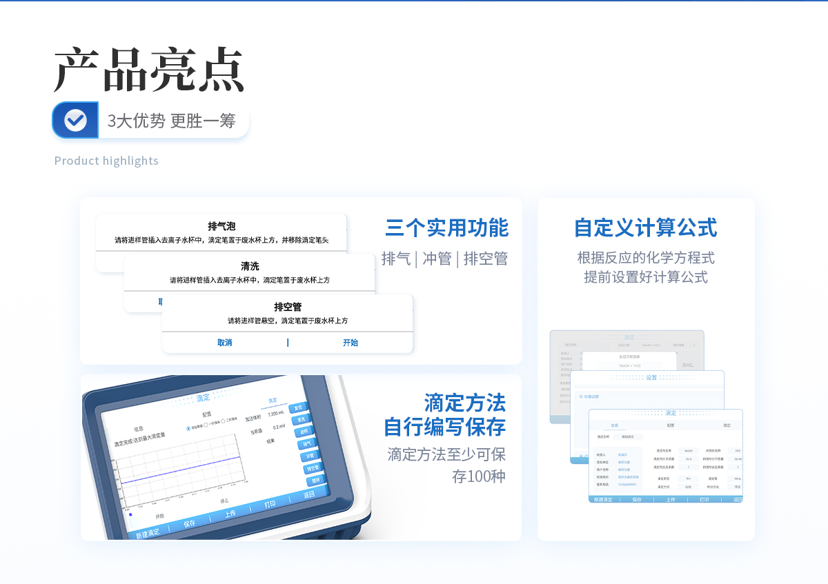 | 1、設備支持電位滴定和pH值測量;用戶選擇不同電極可進行酸堿滴定、氧化還原滴定、沉淀滴定、絡合滴定等多種滴定和pH測量; | 2、用戶可選配電導滴定、永停滴定等擴展模塊,滿足用戶多功能需求; | 3、設備對國家標準中采用的電位滴定法均滿足,用戶可根據檢測需求選擇適配的電極即可; | 4、支持動態滴定、等量滴定、手動滴定的滴定方式,可預設滴定終點或自動識別終點滴定,方便用戶根據樣品特性選擇**滴定工作流程; | 5、可自定義計算公式,根據反應的化學方程式提前設置好計算公式,滴定完成后將自動獲得待測物含量; | 6、滴定方法可自行編寫并保存,形成滴定方法快捷模式,在使用時可直接選擇運行,滴定方法至少可保存100種; | 7、設備可作為實驗室常規手動滴定的滴定裝置使用;計量泵替代滴定管,磁力攪拌功能替代手動搖晃錐形瓶的工作; | 8、儀器實用的三個功能: (1)排氣,可將滴定管或管路內的氣泡排出,避免氣泡帶來的滴定誤差; (2)沖管,可以*少的試劑消耗量使管路內充滿試劑,實現節省試劑的同時減少試劑混合引入的滴定誤差; (3)排空管,可在實驗完成后將管路中的液體收集到滴定管內,避免在拆卸管路時產生藥液濺灑問題。 |