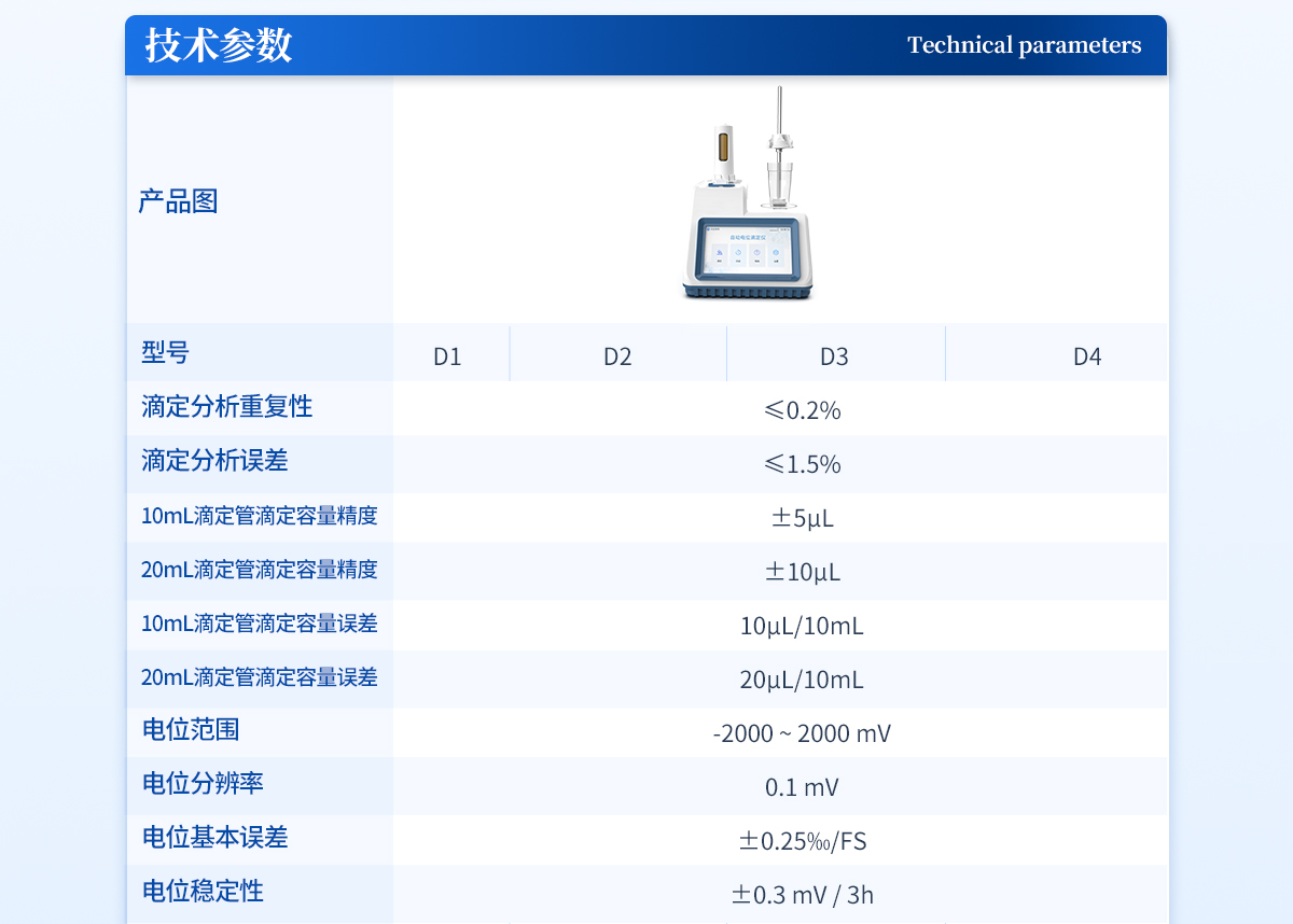 | 滴定分析重復性:≤0.2% | 滴定分析誤差:≤1.5% | 10mL滴定管滴定容量精度:±5μL | 20mL滴定管滴定容量精度:±10μL | 10mL滴定管滴定容量誤差:10μL/10mL | 20mL滴定管滴定容量誤差:20μL/10mL | 電位范圍:-2000—2000mV | 電位分辨率:0.1mV | 電位基本誤差mV:±0.25‰/FS | 電位穩定性mV:±0.3mV/3h | 永停極化電壓:30mV、50mV、100mV | 永停電流范圍:0.00uA-200uA | 永停電壓誤差:±1mV | 永停電流誤差:±1.0% FS | pH范圍:0-14PH | pH分辨率:0.01PH | pH基本誤差:±0.01PH | 溫度測量范圍:-5 - 105℃ | 溫度分辨率:0.1℃ | 溫度基本誤差:0.2℃ |