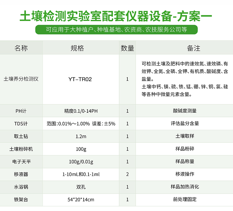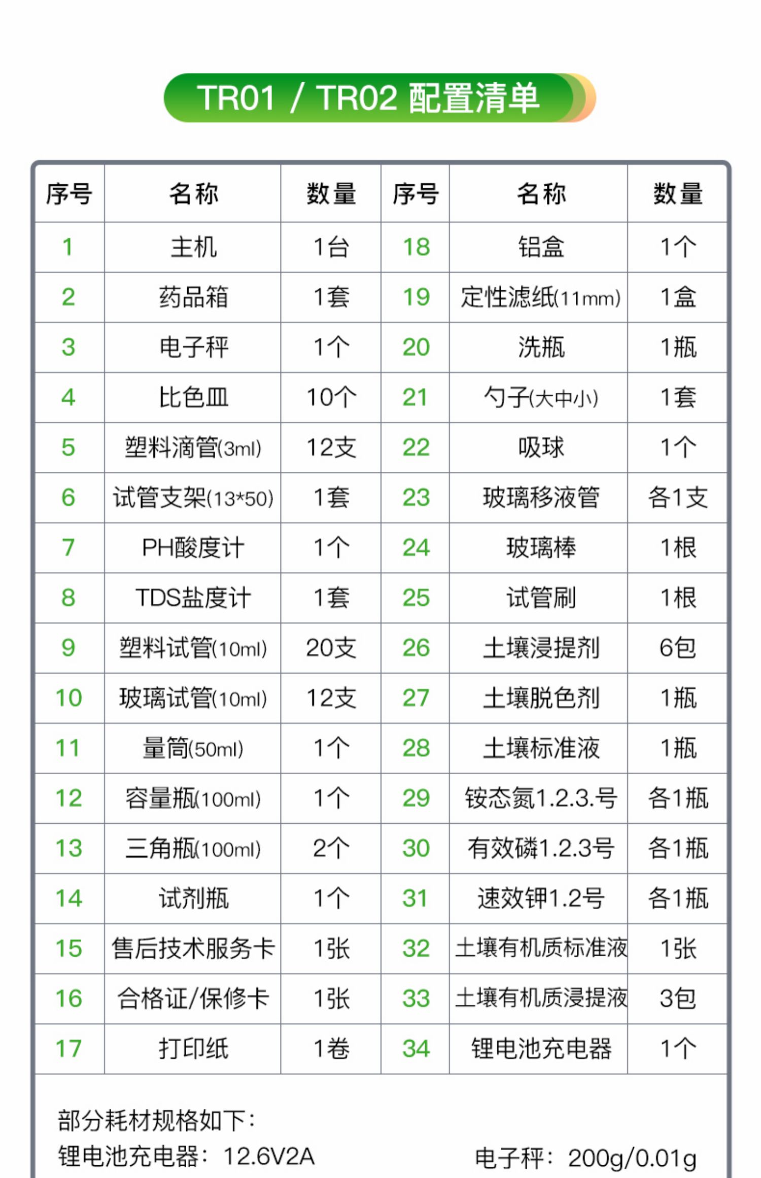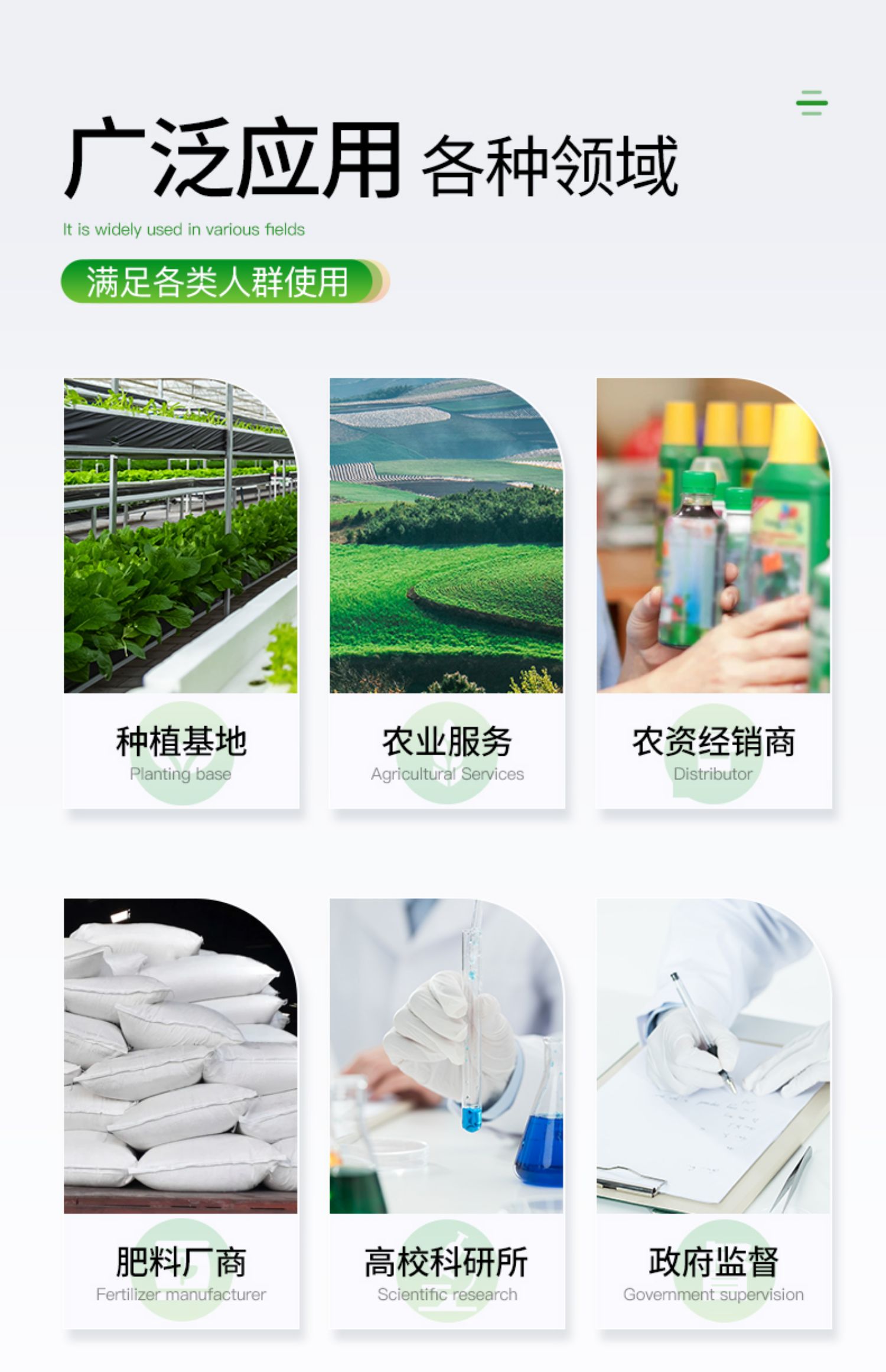 配套齊全,該儀器集藥、器、儀為一體,攜帶方便,相當于一個小型實驗室,用戶只需提供蒸餾水即可在要求時間內(nèi)完成全部操作。適于農(nóng)業(yè)服務(wù)部門或農(nóng)資經(jīng)銷商鑒別肥料真假、肥料廠商肥料生產(chǎn)中控、農(nóng)資質(zhì)檢部門進行農(nóng)資打假,規(guī)范農(nóng)資市場。