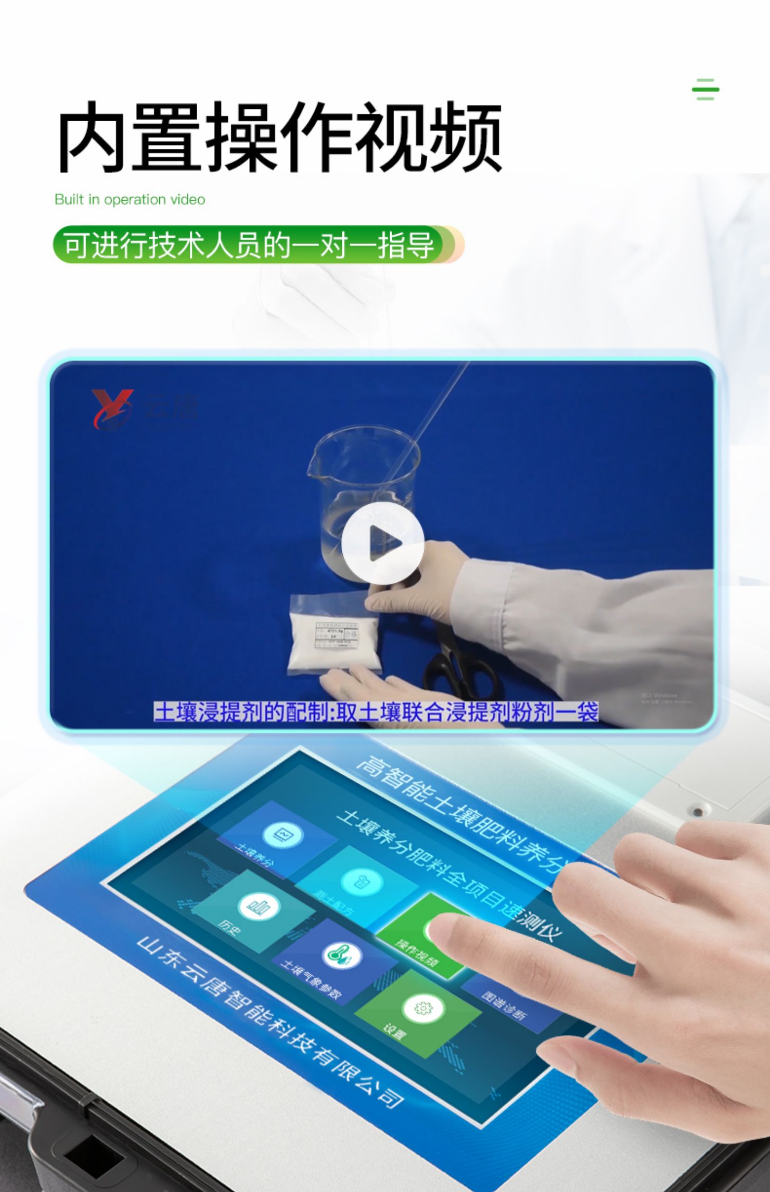 簡介:肥料養(yǎng)分測試儀 品牌:云唐?型號:YT-HD特點:★升級款,噴塑鋼板外殼設(shè)計,堅固耐用,配套成套附件及成品藥劑?!镂㈦娔X控制,數(shù)字化線路、程序化設(shè)計,液晶顯示,交直流兩用,可野外流動測試?!锓直媛剩?.001,觸摸式按鍵,內(nèi)置新一代熱敏打印機,可打印測試結(jié)果?!锓柿橡B(yǎng)分專用檢測儀可檢測化肥、