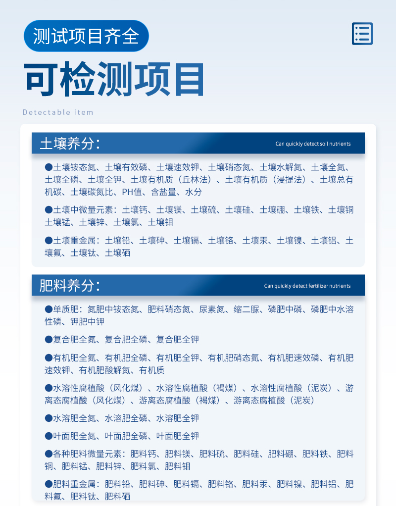 1、土壤養(yǎng)分: ●土壤銨態(tài)氮、土壤有效磷、土壤速效鉀、土壤硝態(tài)氮、土壤水解氮、土壤全氮、土壤全磷、土壤全鉀、土壤有機(jī)質(zhì)(丘林法)、土壤有機(jī)質(zhì)(浸提法)、土壤總有機(jī)碳、土壤碳氮比、PH值、含鹽量、水分。 ●土壤中微量元素:土壤鈣、土壤鎂、土壤硫、土壤硅、土壤硼、土壤鐵、土壤銅、土壤錳、土壤鋅、土壤氯、土壤鉬; ●土壤重金屬:土壤鉛、土壤砷、土壤鎘、土壤鉻、土壤汞、土壤鎳、土壤鋁、土壤氟、土壤鈦、土壤硒。 | 2、肥料養(yǎng)分: ●單質(zhì)肥:氮肥中銨態(tài)氮、肥料硝態(tài)氮、尿素氮、縮二脲、磷肥中磷、磷肥中水溶性磷、鉀肥中鉀; ●復(fù)合肥全氮、復(fù)合肥全磷、復(fù)合肥全鉀; ●有機(jī)肥全氮、有機(jī)肥全磷、有機(jī)肥全鉀、有機(jī)肥硝態(tài)氮、有機(jī)肥速效磷、有機(jī)肥速效鉀、有機(jī)肥酸解氮、有機(jī)質(zhì); ●水溶性腐植酸(風(fēng)化煤)、水溶性腐植酸(褐煤)、水溶性腐植酸(泥炭)、游離態(tài)腐植酸(風(fēng)化煤)、游離態(tài)腐植酸(褐煤)、游離態(tài)腐植酸(泥炭); ●水溶肥全氮、水溶肥全磷、水溶肥全鉀; ●葉面肥全氮、葉面肥全磷、葉面肥全鉀; ●各種肥料微量元素:肥料鈣、肥料鎂、肥料硫、肥料硅、肥料硼、肥料鐵、肥料銅、肥料錳、肥料鋅、肥料氯、肥料鉬; ●肥料重金屬:肥料鉛、肥料砷、肥料鎘、肥料鉻、肥料汞、肥料鎳、肥料鋁、肥料氟、肥料鈦、肥料硒。 | 3、鮮作物營(yíng)養(yǎng): ●作物硝態(tài)氮、作物銨態(tài)氮、作物磷、作物鉀; ●作物中微量元素:作物鈣、作物鎂、作物硫、作物硅、作物硼、作物鐵、作物銅、作物錳、作物鋅、作物氯、作物鉬; ●作物中硝酸鹽、亞硝酸鹽。 | 4、干植株?duì)I養(yǎng): ●植株全氮、植株全磷、植株全鉀 | 5、煙葉營(yíng)養(yǎng): ●全氮、全磷、全鉀、還原糖、水溶性總糖、硼、錳、鐵、銅、鈣、鎂等20項(xiàng)。 | 6、食品(水果、蔬菜等): ●硝酸鹽、亞硝酸鹽、重金屬(鉛、鉻、鎘、砷、汞)等項(xiàng)。 | 7、水質(zhì)中: ●銨態(tài)氮、水中磷、水中鉀、硝酸鹽、亞硝酸鹽、硬度、PH、鐵、銅、錳、鋅、硼、氯、硫、硅、鉬等 |