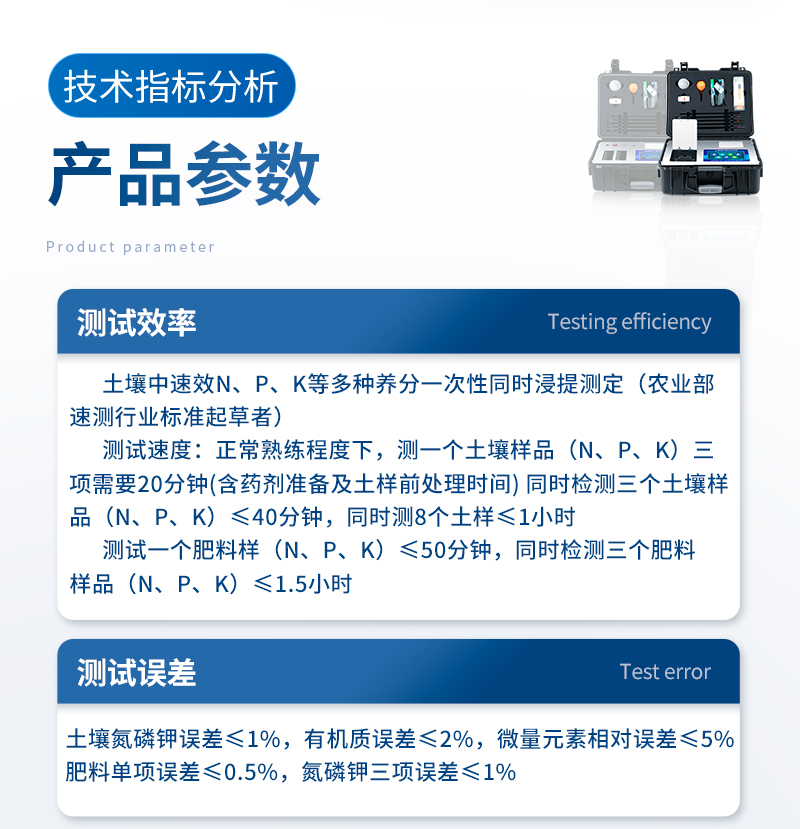 土壤中速效N、P、K等多種養(yǎng)分一次性同時(shí)浸提測(cè)定(農(nóng)業(yè)部速測(cè)行業(yè)標(biāo)準(zhǔn)起草者)。 | 肥料中氮(N)、磷(P)、鉀(K)等養(yǎng)分同時(shí)、快速、準(zhǔn)確檢測(cè)。 | 測(cè)試速度:正常熟練程度下: | 測(cè)一個(gè)土壤樣品(N、P、K)三項(xiàng)需要20分鐘(含藥劑準(zhǔn)備及土樣前處理時(shí)間),同時(shí)檢測(cè)三個(gè)土壤樣品(N、P、K)≤40分鐘,同時(shí)測(cè)8個(gè)土樣≤1小時(shí)。 | 測(cè)試一個(gè)肥料樣(N、P、K)≤50分鐘,同時(shí)檢測(cè)三個(gè)肥料樣品(N、P、K)≤1.5小時(shí)。 |