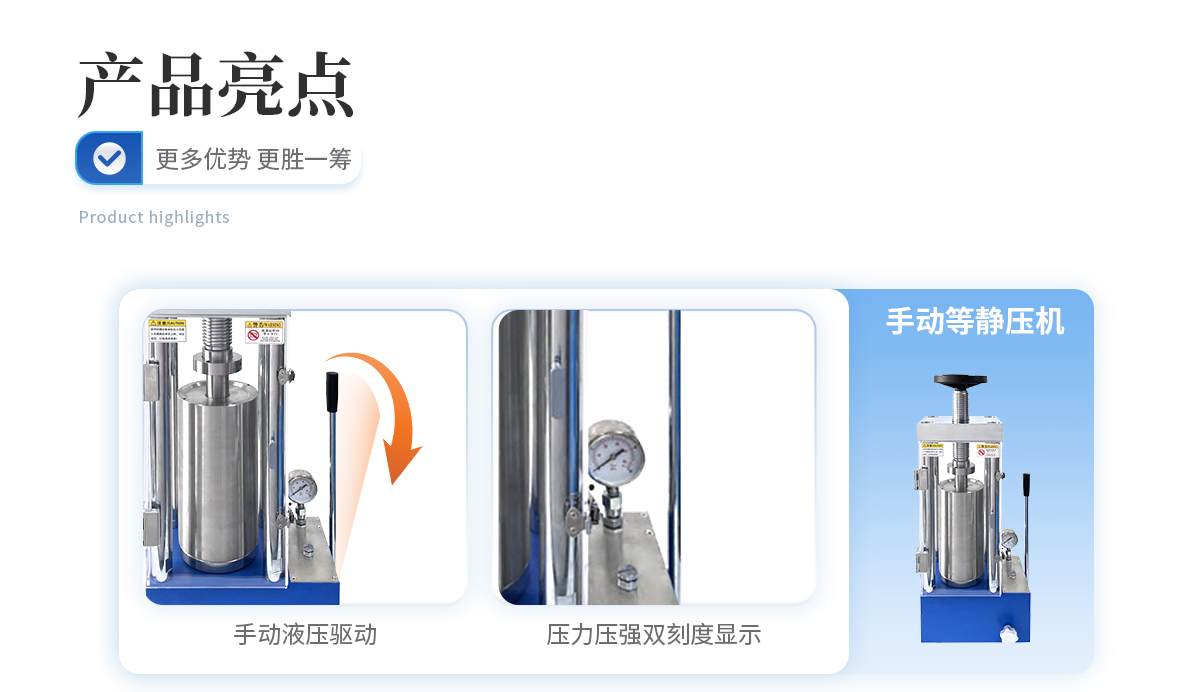 該機采用手動液壓驅動,是等靜壓系列中的入門機型,因其經(jīng)濟性,每次制樣取樣均需要搬動等靜壓腔體,適合制樣少,對工作效率要求不高,有力氣且安全意識較高的男士操作使用。
