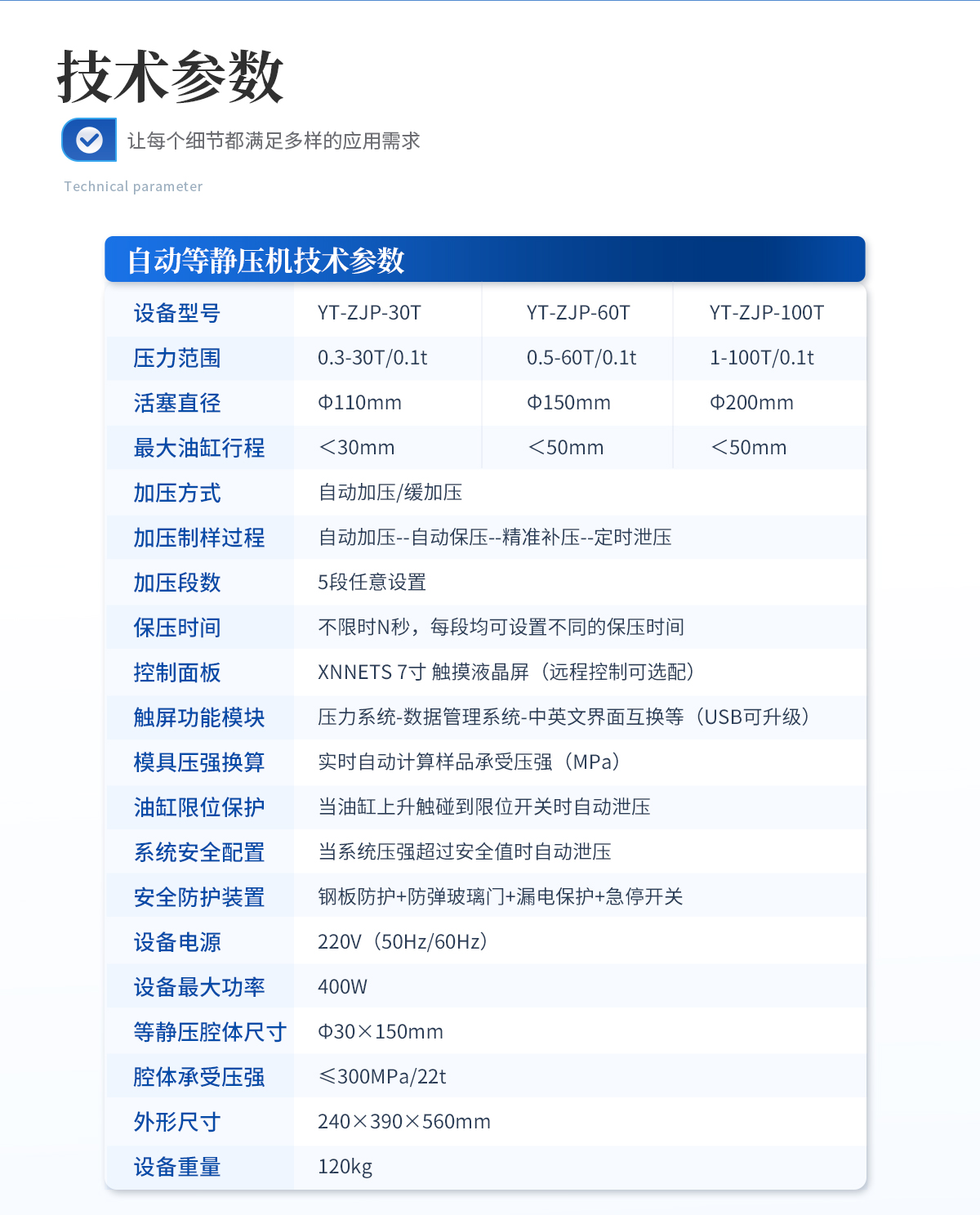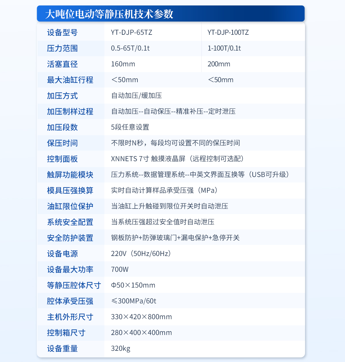簡介:設備簡介:該機采用手動液壓驅動,是等靜壓系列中的入門機型,因其經(jīng)濟性,每次制樣取樣均需要搬動等靜壓腔體,適合制樣少,對工作效率要求不高,有力氣且安全意識較高的男士操作使用。主要技術參數(shù):規(guī)格型號:YT-SJP-40T壓力范圍:0-40T/30MPa壓力換算:1MPa=1.33t/1t=0.75MPa活塞直徑:Ф130mm**活塞行程: <50mm 警示!