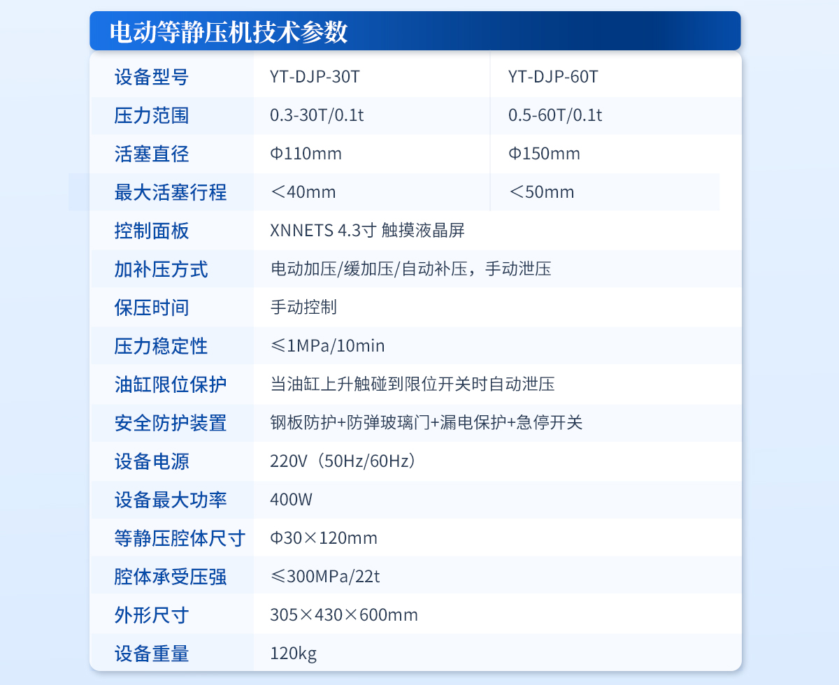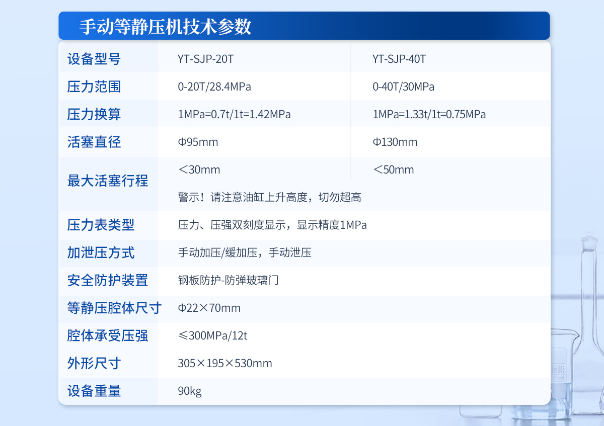 | 規(guī)格型號:YT-SJP-40T | 壓力范圍:0-40T/30MPa | 壓力換算: 1MPa=1.33t/1t=0.75MPa | 活塞直徑: Ф130mm | **活塞行程: <50mm 警示!請注意油缸上升高度,切勿超高 | 壓力表類型:壓力、壓強雙刻度顯示,顯示精度1MPa | 加泄壓方式:手動加壓/緩加壓,手動泄壓 | 安全防護裝置:鋼板防護-防彈玻璃門 | 等靜壓腔體尺寸:Φ40×150mm | 腔體承受壓強:≤300MPa/39t | 外形尺寸:355×215×710mm | 設備重量:130kg | 配置說明:油壓機1臺,等靜壓腔體1套!可根據(jù)需求定制500MPa等靜壓機或橡膠模具 |