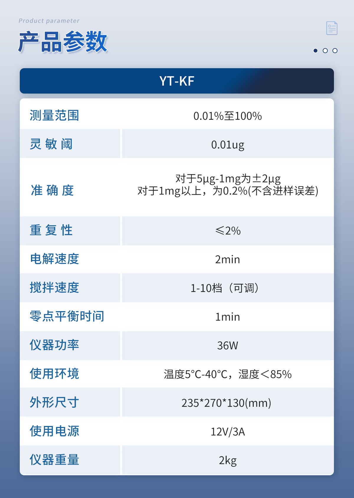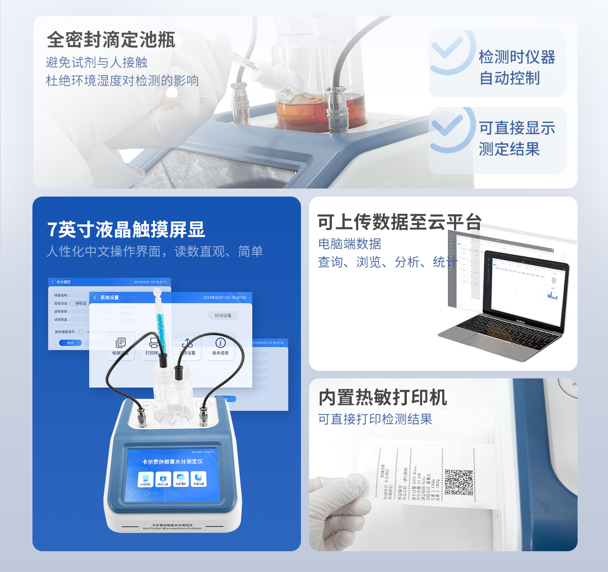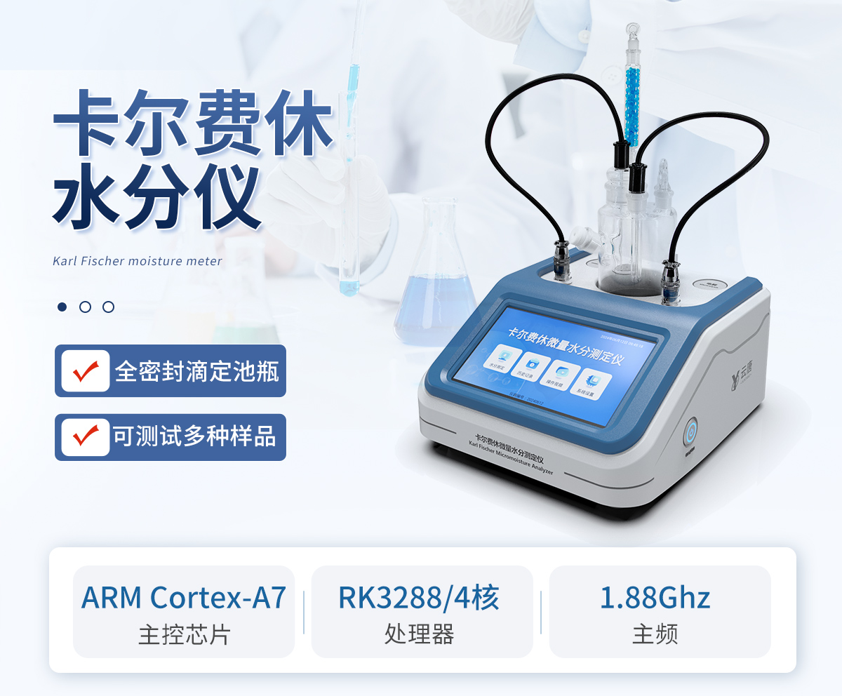 1.儀器主控芯片采用ARM Cortex-A7,RK3288/4核處理器,主頻1.88Ghz,運轉速度更快速,穩定性更強。 2.顯示方式:7英寸液晶觸摸屏顯示,人性化中文操作界面,讀數直觀、簡單。 3.儀器采用全密封滴定池瓶,避免試劑與人接觸,杜絕環境濕度對檢測的影響;檢測過程中儀器自動控制,攪拌、測定60秒左右完成,可直接顯示測定結果,無需人員頻繁操作。 4.儀器內置操作視頻,可直接觀看學習操作方法。 5.儀器可以測試多種樣品,循環檢測,即放即檢。 6.儀器可對樣品信息自由編輯,包括:樣品名稱、樣品編號、檢測單位、檢測人員、聯系方式、受檢單位等。 7.儀器可對檢測樣品測定信息進行設置,例如:電解電流、電解電壓、微量水分含量、測定時間、百分含量、進樣體積、試樣密度、毛重和皮重等。 8.水分檢測方式可根據實際需求選擇體積法或重量法。 9.內置熱敏打印機,可直接打印檢測結果,并可根據需求靈活設置打印內容(二維碼,樣品編號、檢測單位、檢測人員、聯系電話、受檢單位、檢測日期等)。 10.樣品檢測結果可通過二維碼掃碼查看。 11.檢測數據可通過歷史記錄進行檢索,通過設置檢測日期、樣品編號、檢測單位、檢測人員、樣品名稱、受檢單位等信息查找對應數據。 12.儀器配備標準USB接口,免驅動安裝。檢測結果存儲容量20萬條以上,可生成Excel表格進行拷貝。 13.儀器配備WiFi通信模塊,可上傳數據至云平臺,實現電腦端數據查詢、瀏覽、分析、統計等。 14.儀器可定向遠程更新,進行升級維護,無需返廠更新,節省時間及人力成本,避免了物流運輸導致設備損壞的潛在風險。