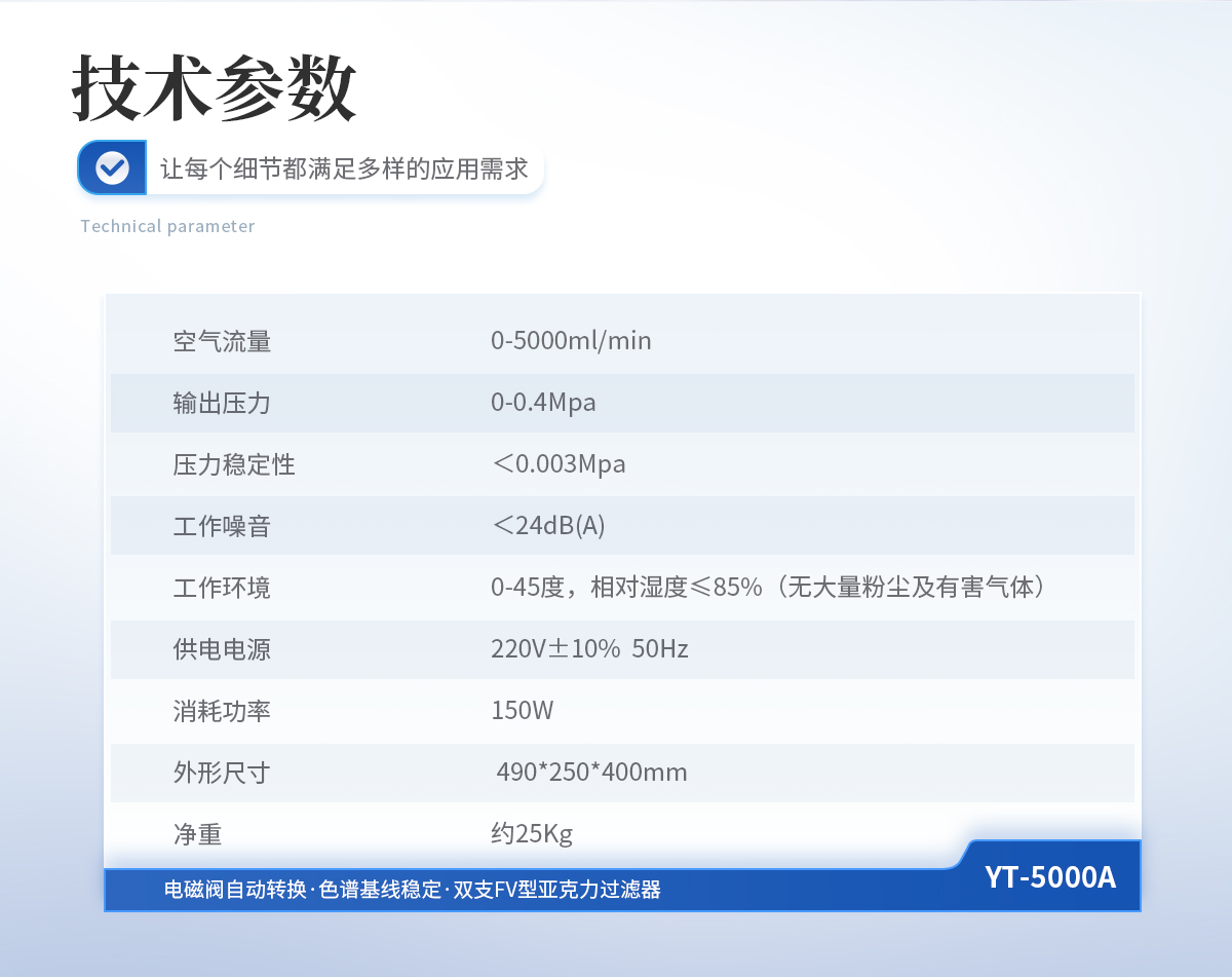 | 1、空氣流量: 0-3000ml/min | 2、輸出壓力: 0-0.4Mpa | 3、壓力穩(wěn)定性:<0.003Mpa | 4、工作噪音: <24dB(A) | 5、工作環(huán)境: 0-45度,相對(duì)濕度≤85%(無大量粉塵及有害氣體) | 6、供電電源: 220V±10% 50Hz | 7、消耗功率: 2000型(120W) | 8、外形尺寸: 490*250*400mm | 9、凈重: 約22Kg |