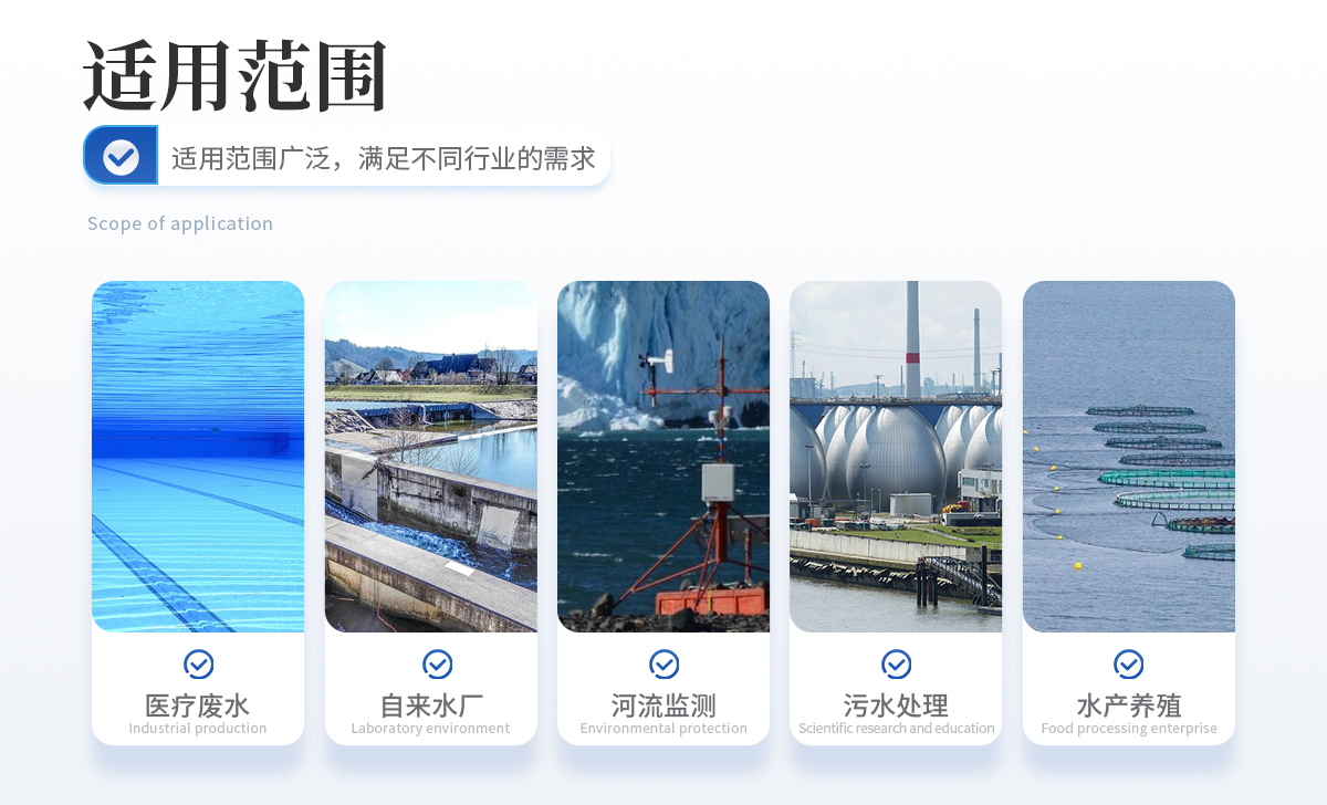 適用于純凈水廠、自來水廠、生活污水處理廠、工業污水、水產養殖、河流監測、游泳場館、水源保護、生產監測、科研實驗等。