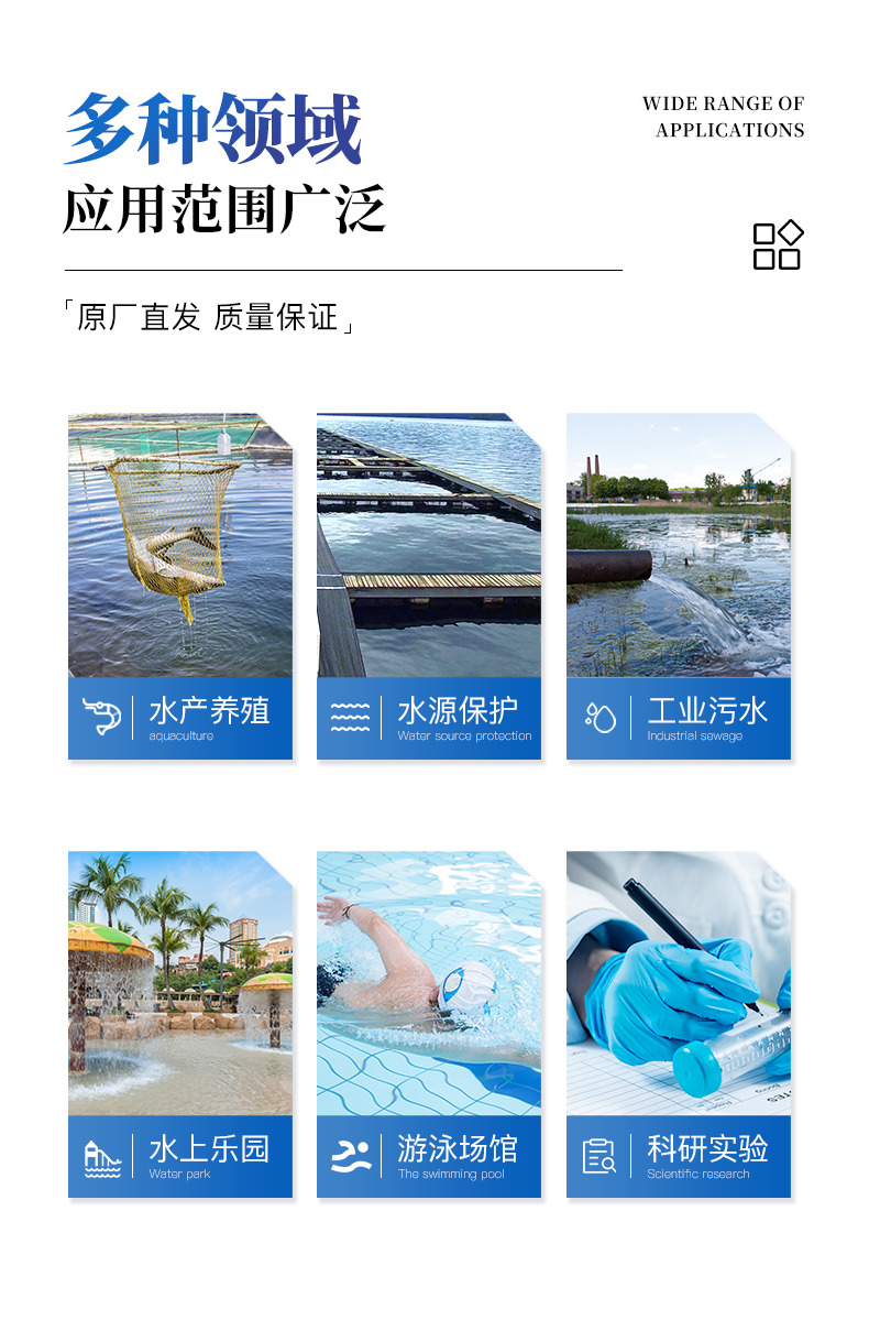 適用于游泳場(chǎng)館、戶內(nèi)外游泳池、水上樂園、溫泉浴池、純凈水廠、自來水廠、生活污水處理廠、工業(yè)污水、水產(chǎn)養(yǎng)殖、河流監(jiān)測(cè)、水源保護(hù)、生產(chǎn)監(jiān)測(cè)、科研實(shí)驗(yàn)等。