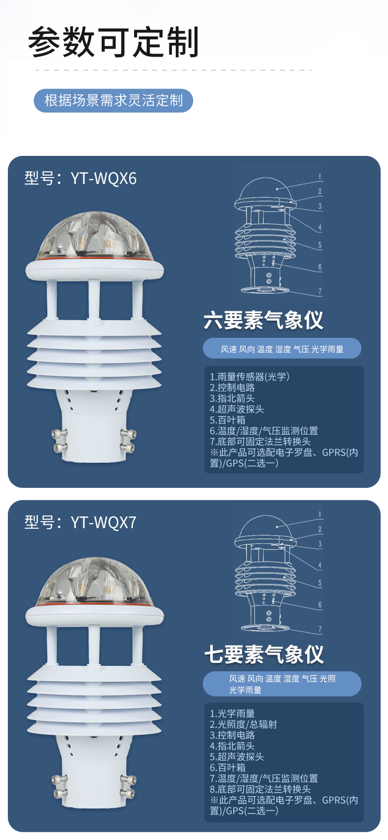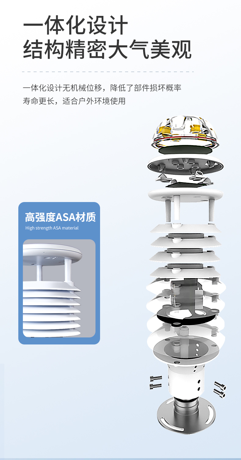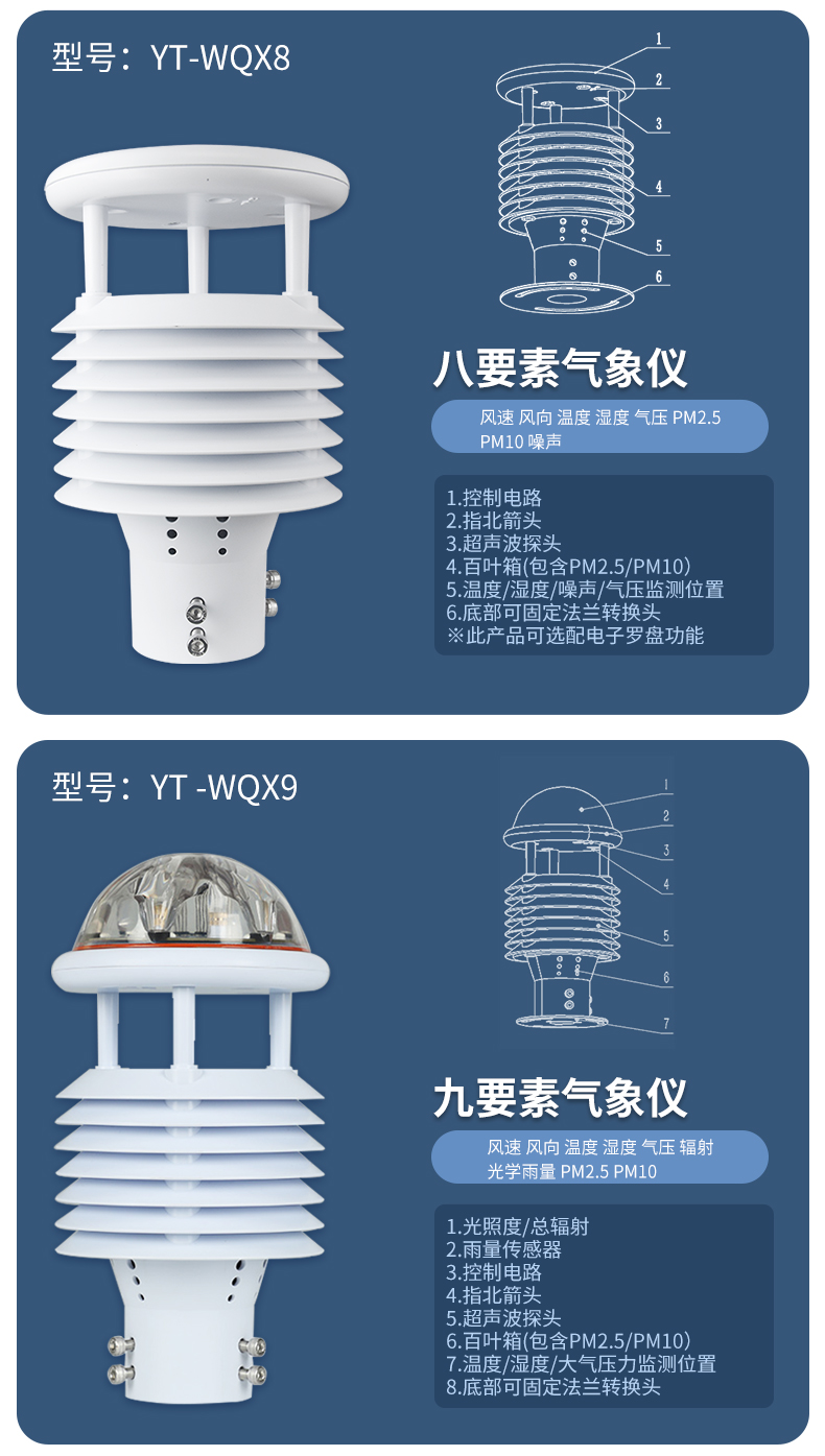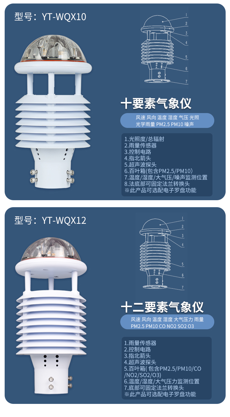 YT-WQX7型七要素微氣象儀將氣象標準七參數(空氣溫度、空氣濕度、風速、風向、大氣壓力、光學雨量、光照)過一個高集成度結構來實現,可實現戶外氣象參數24小時連續在線監測,通過數字通訊接口將七項參數一次性輸出給用戶。