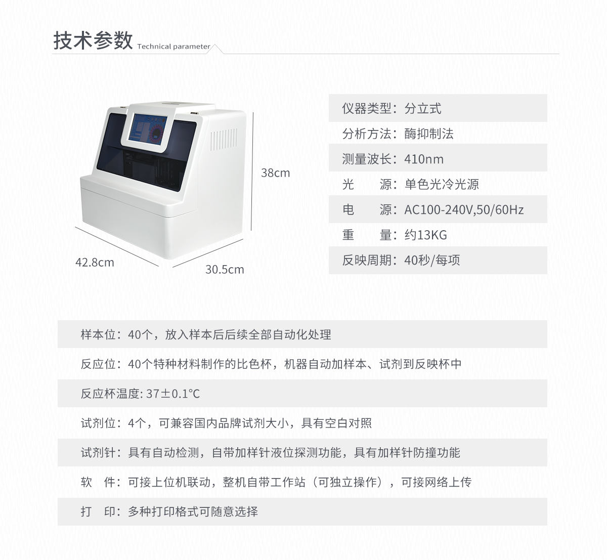 波長配置:410試 劑 針:3根檢測通道:20個反應(yīng)溫度:37℃,儀器具有自動加溫溫控系統(tǒng)觸 摸 屏:7寸觸摸屏,可單機操作比 色 皿:容量 0 - 4.5ml試 劑 盒:配套試劑存放盒,可整體取出清洗功能:可自動清洗試劑管路,避免試劑污染加樣功能:儀器按照試劑要求自動、按時、按量加入試劑,提高工作效率自動混勻:儀器測試過程中自動震蕩混勻保證試劑充分反應(yīng)實時監(jiān)控:儀器測試過程中顯示實時運行狀態(tài)打印功能:內(nèi)置熱敏打印機,可快速打印檢測結(jié)果,方便數(shù)據(jù)留存數(shù)據(jù)存儲:大容量存儲器,能存儲12萬條數(shù)據(jù)數(shù)據(jù)接口:外接USB接口,網(wǎng)線接口網(wǎng)絡(luò)連接:可連接有線網(wǎng)絡(luò)和無線wifi上位機軟件:儀器配套電腦端上位機軟件,可通過軟件進(jìn)行寫入?yún)?shù)及讀取數(shù)據(jù)樣本檢測:儀器自動對未正常放置的樣本或異常的樣本進(jìn)行檢查并報警提示試劑檢測:儀器測試前和測試過程中時刻對試劑進(jìn)行檢查,檢查試劑是否缺失,如有異常儀器會進(jìn)行報警提示,對已經(jīng)加入試劑的樣本進(jìn)行正常測試,不影響測試結(jié)果,對未測試的樣本停止測試。數(shù)據(jù)上傳:儀器數(shù)據(jù)可傳入電腦端,按照客戶需求進(jìn)行保存或打印儀器重量:約7KG儀器尺寸:410mm*290mm*202mm