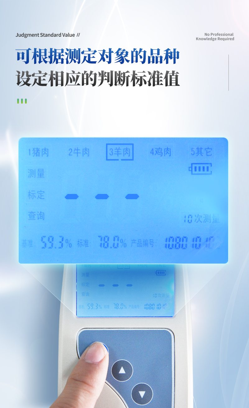 肉類水分檢測儀主要用于快速豬肉、牛肉、雞肉等動物肉類水分含量,從而判斷所測樣品是否為注水肉,該儀器設計精巧,單手可持,儀器可根據測定對象的品種,設定相應的判斷標準值。