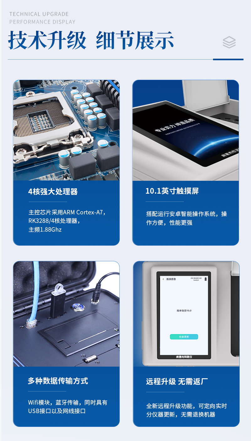 | 1、儀器采用臺式一體化系統檢測技術,將分光光度模塊、數字化管理模塊、無線通訊模塊高度集成于一體,支持檢測幾十種食品安全檢測項目,同時預留升級檢測方法。 | 2、儀器檢測模塊標準化、智能化,檢測項目可隨意自由組合。檢測箱體內置多個標準檢測單元,檢測模塊可以調整配置。 | 3、顯示屏幕:儀器采用7英寸液晶觸摸屏,搭配運行安卓智能操作系統,主控芯片采用ARM Cortex-A7,RK3288/4核處理器,主頻1.88Ghz,操作方便,性能更強。 | 4、檢測通道:≥12通道;采用精密旋轉比色池設計,使用同芯片同光源校準精度,解決不同光源之間的誤差值,更加準確**。 | 5、儀器光源:高精度進口四波長冷光源,每個通道均配置 410、520、590、630nm 波長光源,標配**的光路切換裝置,**光路切換功能可實現64波長,并且所有檢測項目可實現所有通道同時檢測。 | 6、通訊接口:配備無線通信模塊、可選配4G(APN)通訊模塊和藍牙傳輸,同時具有USB接口,可以多方式實現數據保存及數據傳輸。 | 7、存儲方式:支持U盤存儲,標準USB接口,免驅動安裝。檢測結果存儲容量20萬條以上,可生成Excel表格進行拷貝,并具有登錄保護功能。 | 8、智能化操作系統 | 8.1、操作系統:儀器可在同一檢測界面自動對應相關檢測通道,一次性選擇1-12個樣品名稱,無需退出界面,節省操作時間。并可以對每個通道屬性和樣品信息單獨進行編輯,例如送檢單位、人員,檢測人員等,打印時勾選打印顯示。 | 8.2、限量規判系統:具有限量查詢、添加物質合規判定系統。檢測出結果后,系統自動調用系統數據庫中相關國標進行比對判定,客觀顯示結果是否合格。 | 8.3、數據監管系統:同步對接監管平臺,數據可局域網和互聯網數據上傳,檢測結果可選擇直接傳至食品安全監管平臺。進行區域食品安全監管及大數據分析處理與數據統計,檢測區域食品安全長短期動態,達到食品安全問題預估、預警。 | 8.4、打印系統:內置全新打印機,可以打印:項目名稱,二維碼,抽樣信息、檢測信息,受檢信息、復核信息、抽樣日期、檢測日期等信息的打印。 | 9、供電模式:儀器交直流兩用,直流12V供電(標配),可連接車載電源,亦可選配6ah大容量充電鋰電池,電量可實時顯示,方便戶外流動測試。 | 10、儀器具有重新校準、鎖定、恢復出廠設置功能, | 11、外觀尺寸:415X310X150(mm) ,并可加配鋁合金手提箱 |