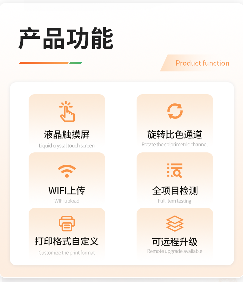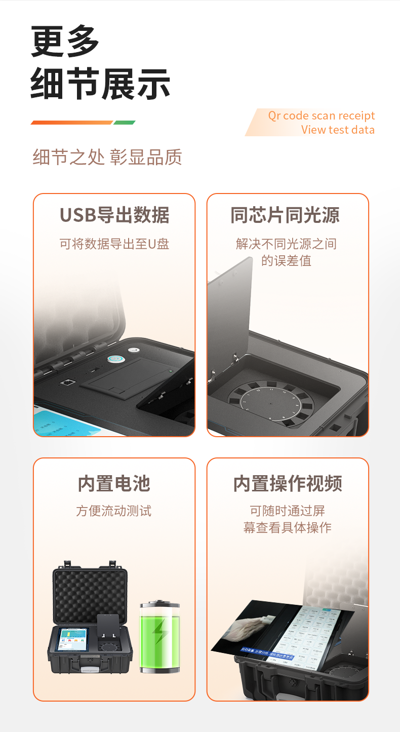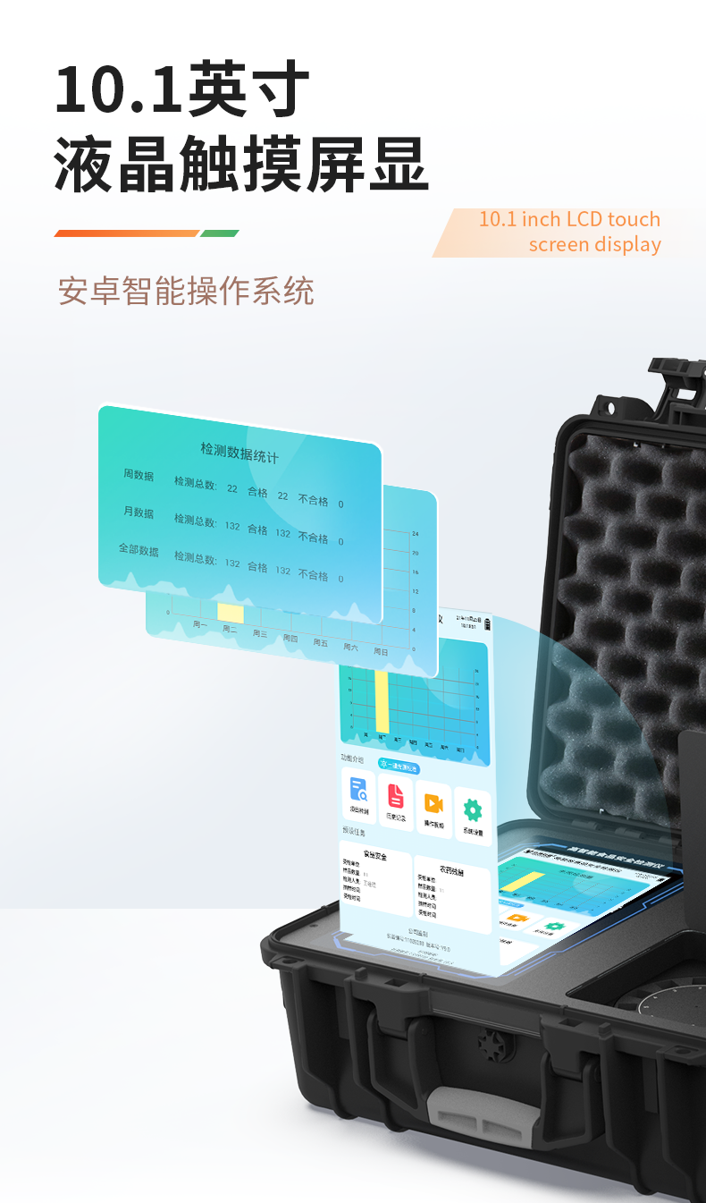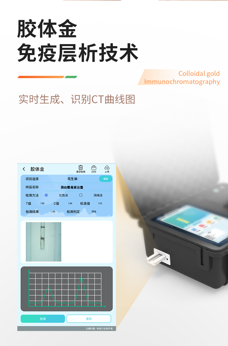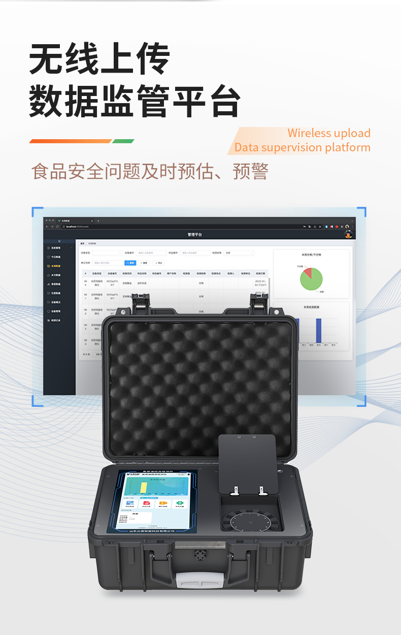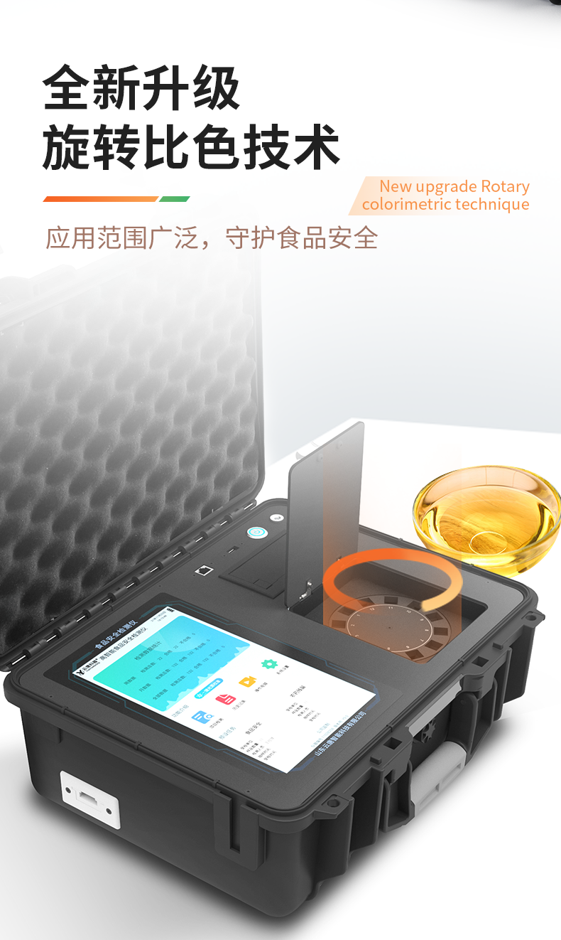 1、儀器采用手提一體化系統(tǒng)檢測技術,將分光光度模塊、膠體金檢測模塊、新型農殘檢測模塊、數字化管理模塊、無線通訊模塊高度集成于一體,支持檢測200種食品安全檢測項目,同時預留升級檢測方法。2、儀器檢測模塊標準化、智能化,檢測項目可隨意自由組合。檢測箱體內置多個標準檢測單元,檢測模塊可以調整配置。3、顯示屏幕:儀器采用10.1英寸豎向液晶觸摸屏顯,搭配運行安卓智能操作系統(tǒng),主控芯片采用ARM Cortex-A7,RK3288/4核處理器,主頻1.88Ghz,操作方便,性能更強。4、檢測通道:≥12通道;采用精密旋轉比色池設計,使用同芯片同光源校準精度,解決不同光源之間的誤差值,更加準確**。(1-12通道間誤差0.1%,**號:**202022821055.2)5、儀器光源:高精度進口四波長冷光源,每個通道均配置 410、520、590、630nm 波長光源,標配**的光路切換裝置,**光路切換功能可實現(xiàn)64波長,并且所有檢測項目可實現(xiàn)所有通道同時檢測。6、設備可一鍵校準,自動保存校準數據,自動對比校驗,得到精準光源,采用Android SP存儲數據,光源數據永不丟失,方便每一次使用。7、通訊接口:配備無線通信模塊、4G(APN)通訊模塊、藍牙傳輸,同時具有雙USB接口以及RJ45網線接口,可以多方式實現(xiàn)數據保存及數據傳輸。8、存儲方式:支持U盤存儲,標準USB接口,免驅動安裝。檢測結果存儲容量20萬條以上,可生成Excel表格進行拷貝,并具有登錄保護功能。9、智能化操作系統(tǒng):9.1、操作系統(tǒng):儀器可在同一檢測界面自動對應相關檢測通道,一次性選擇1-12個樣品名稱,無需退出界面,節(jié)省操作時間。并可以對每個通道屬性和樣品信息單獨進行編輯,例如送檢單位、人員,檢測人員等,打印時勾選打印顯示。9.2、數據集成系統(tǒng):設備首頁自動匯總分析檢測數據,包含:周檢測數據、月檢測數據,全部檢測總數量,包含檢測總數,合格數,不合格數,以及相關柱形分析圖,各項檢測數據一目了然,無需電腦查詢,更加快捷直觀。9.3、數據庫系統(tǒng):十幾項數據庫分類管理儀器:包含項目類型、項目數據、檢測數據、歷史記錄、國標信息、曲線信息、采樣信息、檢測信息、受檢信息、復核信息、圖表信息、光源校準信息、打印樣式信息、樣品庫信息等等,數據庫之間互相協(xié)調聯(lián)動保證數據的真實完整性。同時產品數據庫以及歷史檢測記錄支持一鍵檢索功能。9.4、限量規(guī)判系統(tǒng):具有限量查詢、添加物質合規(guī)判定系統(tǒng)。檢測出結果后,系統(tǒng)自動調用系統(tǒng)數據庫中相關國標進行比對判定,客觀顯示判定結果是否合格。9.5、項目預設系統(tǒng):儀器具有任務預設模塊,一鍵提前預設,給出方便快捷的新檢測方案,每一個任務分別可以設置不同的樣品、批次、編號、來源、備注、抽樣信息、檢測信息、受檢信息、復核信息等更多信息。樣品送檢時一鍵調取保存信息,并可多次調取,大大提高檢測效率。9.6、數據監(jiān)管系統(tǒng):同步對接監(jiān)管平臺,數據可局域網和互聯(lián)網數據上傳,檢測結果可直接傳至食品安全監(jiān)管平臺。進行區(qū)域食品安全監(jiān)管及大數據分析處理與數據統(tǒng)計,監(jiān)測區(qū)域食品安全長短期動態(tài)及問題預估、預警。9.7.1、全新打印系統(tǒng):內置全新打印機,新創(chuàng)自定義打印方式,可按需靈活勾選控制:產品合格證(國家農業(yè)部標準要求),二維碼,抽樣信息、檢測信息,受檢信息、復核信息、抽樣日期、檢測日期等信息的打印。9.7.2、A4紙版本報告打印功能(可選配):設備擁有兩種結果展示方式,可以自動生成A4打印模板和小票打印模板兩種樣式,可通過WiFi及網線等方式鏈接外置打印機可進行打印。10、供電模式:儀器交直流兩用,直流12V供電,可連接車載電源,配6ah大容量充電鋰電池,電量可實時顯示,方便戶外流動測試。11、膠體金檢測模塊:采用單通道CMOS成像處理技術及膠體金免疫層析技術,可讀取膠體金卡數據,自動采集、處理分析,將檢測結果顯示,并可根據參考限值自動判斷檢測結果,可檢測常見的獸藥殘留、生物毒素、抗生素、違禁添加物等。11.1、探測技術:CMOS成像探測;11.2、檢測通道:1個通道;11.3、檢測方式:消線法和比色法;11.4、顯示模式:陰性或陽性;11.5、曲線形式:軌道式掃描方式,顯示金標卡圖像,實時生成、識別CT曲線圖,無需手動調整,完成檢測后自動退出檢測卡。兼容市場上其他金標卡,使用耗材不受限制。12、儀器具備遠程升級功能,可定向分客戶分儀器更新,開機后自動更新,并可持續(xù)性免費更新系統(tǒng)版本,無需像傳統(tǒng)產品返廠更新,節(jié)省時間及人力成本并避免了物流運輸返廠升級導致設備損壞的潛在風險。