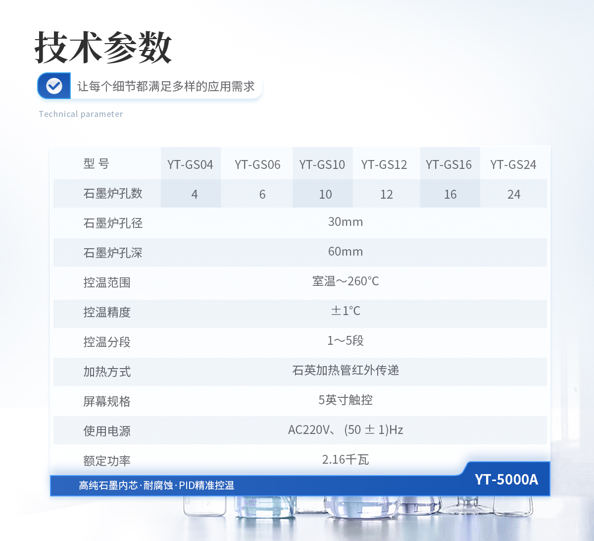 | 石墨爐孔:孔徑30mm,孔深60mm,孔數2×2 | 控溫范圍:室溫~260℃ | 控溫精度:±1℃ | 控溫分段:1~5段 | 加熱方式:石英加熱管紅外傳遞 | 屏幕規格:5寸觸控 | 主機外型尺寸:寬387mm×深371mm×高168mm | 使用電源:AC220V、 (50 ± 1)Hz | 額定功率:1千瓦 |