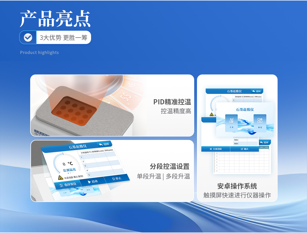 | 使用5寸彩色觸摸屏進行儀器操作,配備安卓操作系統,方便快捷。 | 采用PID 控溫技術,控溫精度高,升溫速度快, 從室溫到260℃僅需25分鐘。 | 分段控溫設置,即可單段升溫,也可多段升溫,設置靈活,儀器將自動按順序完成。更適于易產生泡沫的樣品。 | 采用優質石墨爐內芯,平均溫差較小,樣品效果一致性好,熱傳導效率更高。石墨塊具有特氟龍涂層,耐腐蝕,延長使用壽命。 |