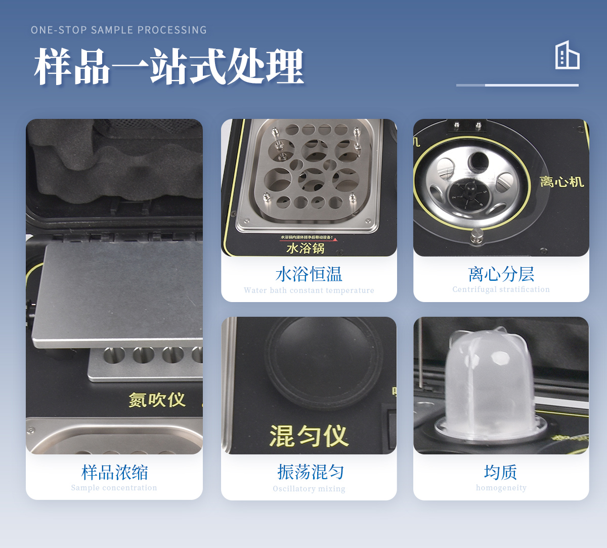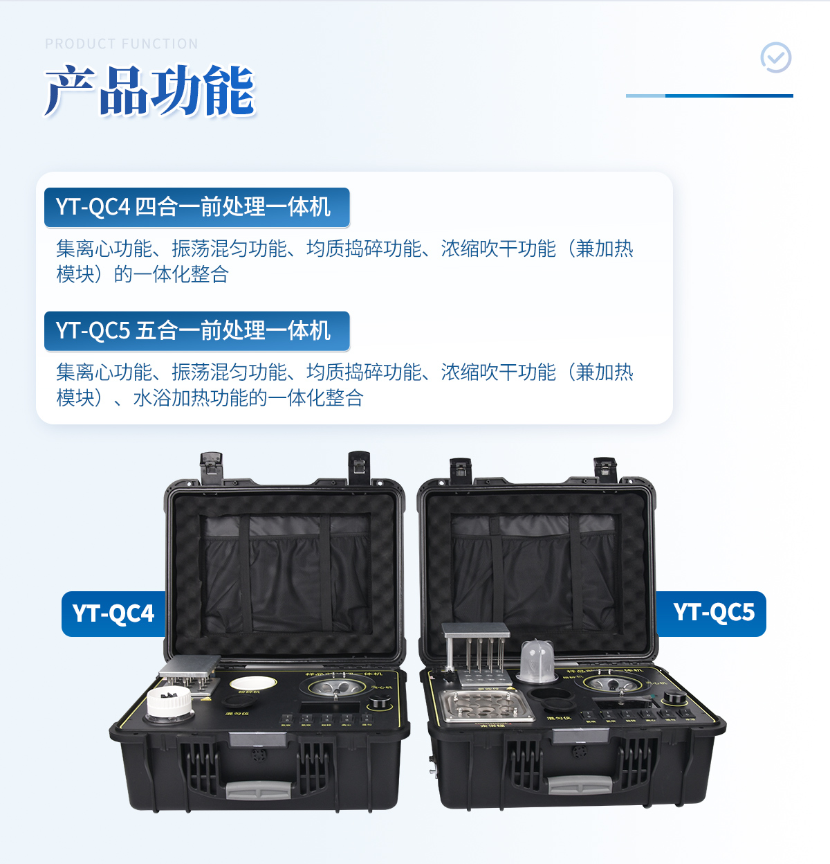 應(yīng)國內(nèi)用戶的實際需求,自行研制開發(fā)的新型儀器——QC05型樣品前處理一體機。樣品前處理集成箱將樣本前處理過程中樣品濃縮、水浴恒溫、離心分層、均質(zhì)、振蕩混勻等步驟所需設(shè)備進行集成,僅需一臺樣品前處理集成箱設(shè)備即可完成所有樣本前處理過程,并且方便攜帶,不僅適用于現(xiàn)場檢測使用,還可用于色譜、質(zhì)譜等分析樣品的純化和制備。
