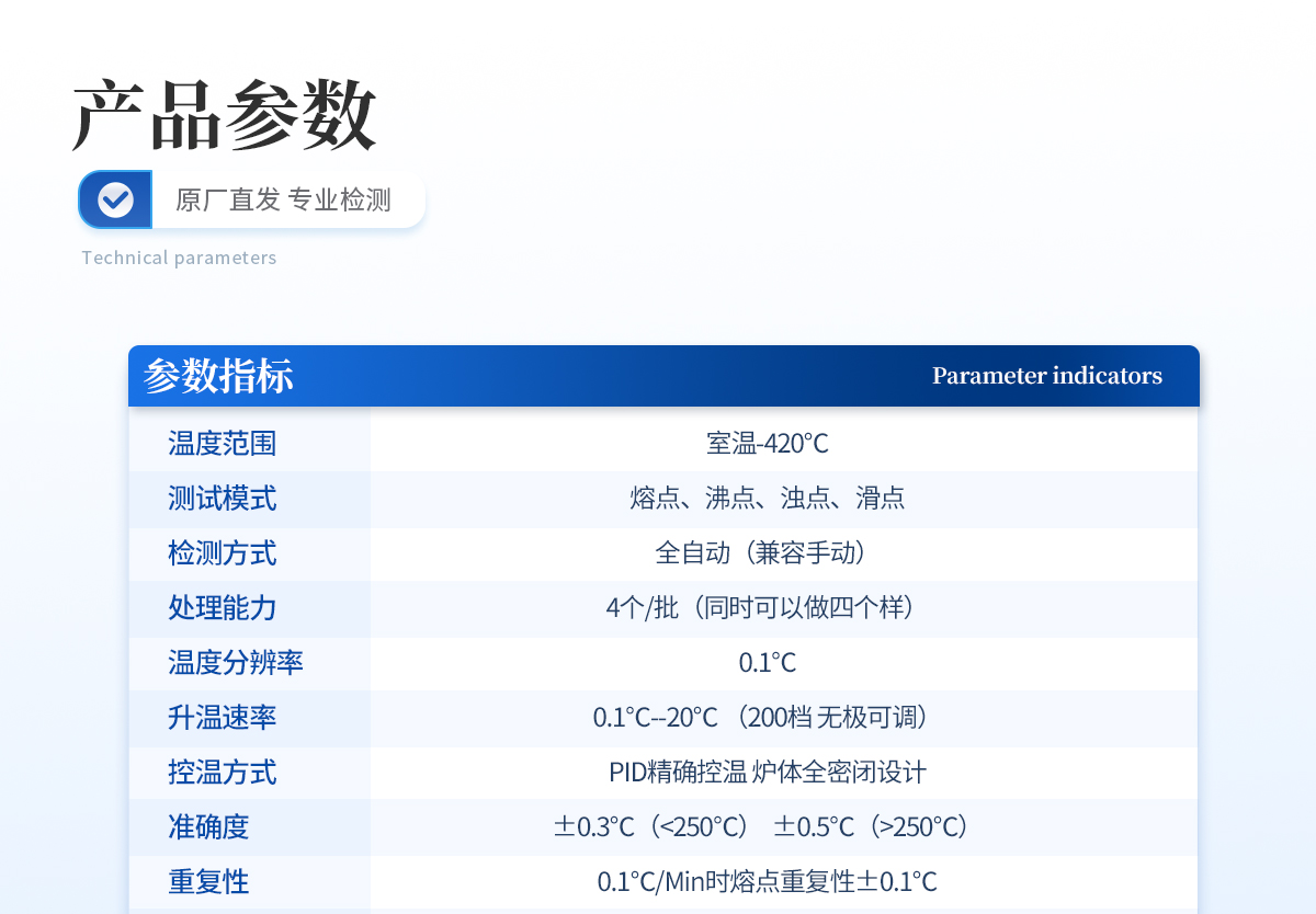 | 1、自動化集成,實現一鍵測定功能; | 2、一次處理4個樣品; | 3、高清視頻代替傳統顯微鏡 目視高; | 4、全自動記錄熔程,初熔,終熔; | 5、可通過打印機直接打印數據。 |