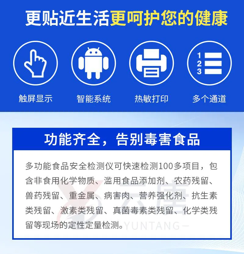 1、儀器采用臺式一體化系統(tǒng)檢測技術,將分光光度模塊、數(shù)字化管理模塊、無線通訊模塊高度集成于一體,支持檢測200種食品安全檢測項目,同時預留升級檢測方法。