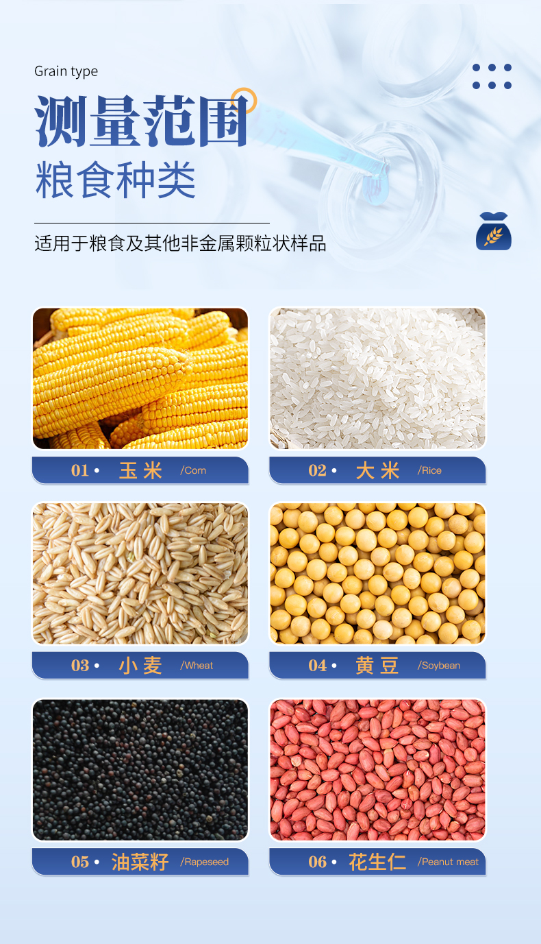 測量范圍:可測量谷類、玉米、東北玉米、大麥、小麥、白小麥、大米、豆粕、花生仁、菜粕、高粱、黑芝麻、棉籽、棉粕、秈谷、大豆、油菜籽、飼料、蔬菜種子等非金屬顆粒狀物質。