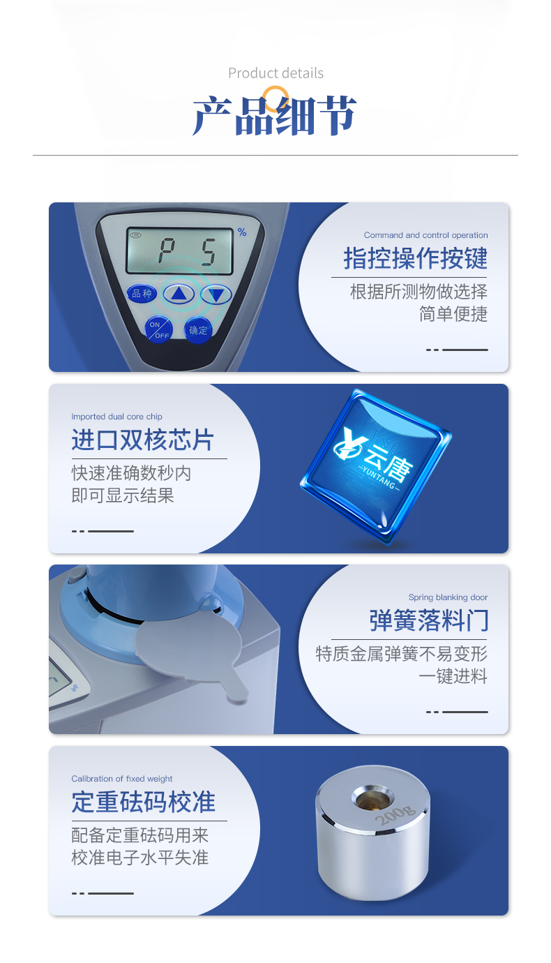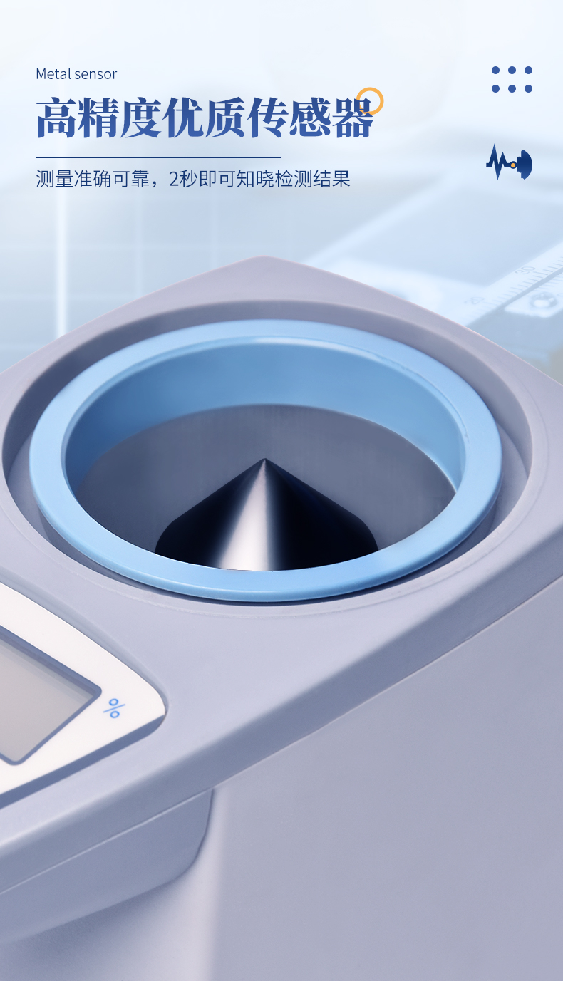 操作簡單:20個常見品種已預先定標,不需秤樣、用料簡取樣后可立即測量水分
