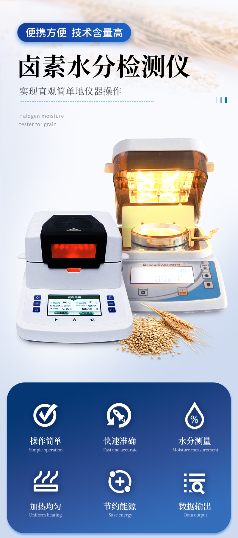 傳統的水分測定一般是采用烘箱干燥法,一個樣品的測試需要兩三個甚至三四個小時,而且還需通過天平稱重、人工計算,才能得出樣品的水分值(含水率)。烘箱法水分測定的低效率,不能夠適應高節奏的企業生產需要。幸運牌快速水分測定儀采用**率的烘干加熱器-***的環狀鹵素燈,對樣品進行快速、均勻的加熱,樣品的水份持續不斷的被烘干。整個測量過程,儀器全自動的實時顯示測量結果:樣品重量、含水量、含固量、測定時間、加熱溫度等。