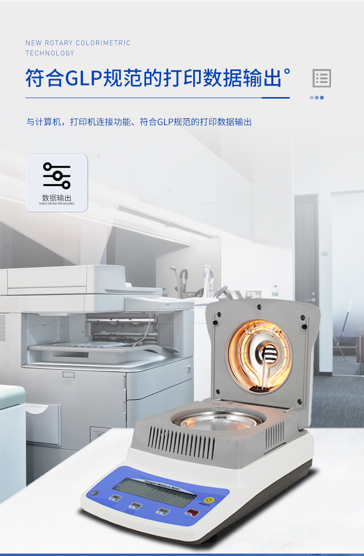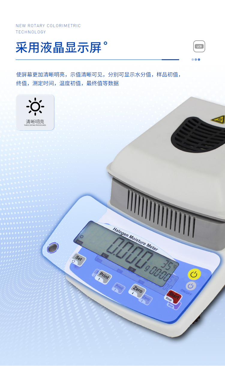環狀的鹵素燈確保樣品得到均勻加熱,操作簡便、測量準確。水分測定儀在測量樣品重量的同時,儀器采用環形管鹵素加熱方式,快速干燥樣品,在干燥過程中,水分儀持續測量并即時顯示樣品丟失的水分含量%,干燥程序完成后,*終測定的水分含量值被鎖定顯示。與**烘箱加熱法相比,鹵素加熱可以在高溫下將樣品均勻地快速干燥,樣品表面不易受損,其檢測結果與國標烘箱法具有良好的一致性,具有可替代性,且檢測效率遠遠高于烘箱法。智能化操作,一般樣品只需幾分鐘即可完成測定。該儀器操作簡單,測試準確,顯示部分采用液晶顯示屏-使屏幕更加清晰明亮,示值清晰可見,分別可顯示水分值,樣品初值,終值,測定時間,溫度初值,*終值等數據,并具有與計算機,打印機連接功能、符合GLP規范的打印數據輸出。