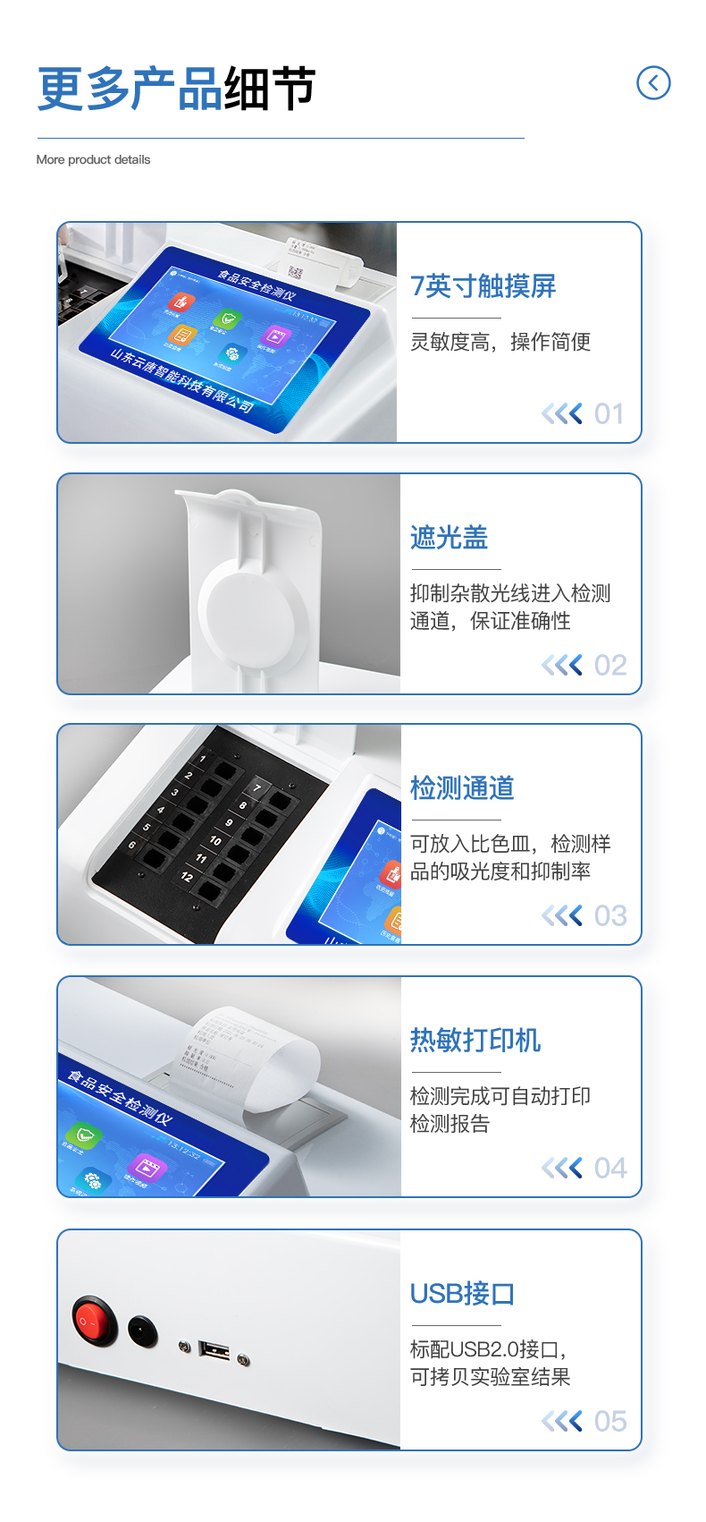 可快速檢測各類食品中的亞硝酸鹽、二氧化硫、甲醛、吊白塊、雙氧水、硼砂、農藥殘留、乳及乳制品中蛋白質、硝酸鹽、重金屬鉛的含量,儀器預留其他項目檢測程序和端口,根據日后需求可方便的自主增加檢測項目。