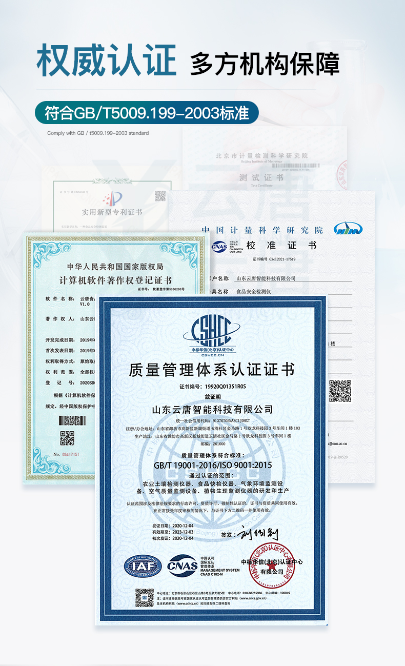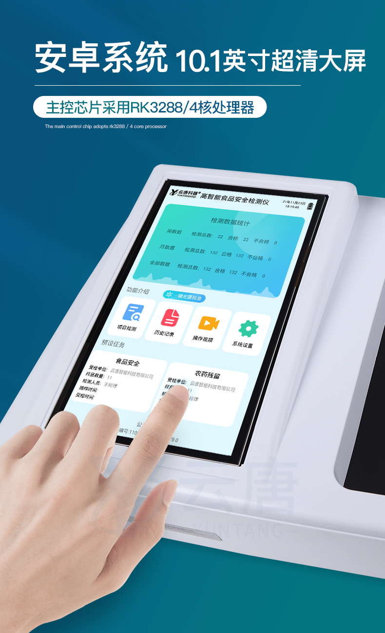 山東云唐智能科技有限公司生產的高智能食品安全檢測儀為集成化食品安全快速檢測分析設備,采用臺式一體化設計,可快速檢測200多種食品安全項目,包含非食用化學物質、濫用食品添加劑、農藥殘留、獸藥殘留、重金屬、病害肉、營養強化劑、抗生素類殘留、激素類殘留、真菌毒素類殘留、化學類殘留等項目的定性定量檢測。目前廣泛應用于市場監管局、檢測中心、衛生監督部門、農業部門、院校及各單位食堂、食品肉產品深加工企業、商超市場、司法部門、餐飲機構、養殖場、屠宰場、檢驗檢疫部門等單位。