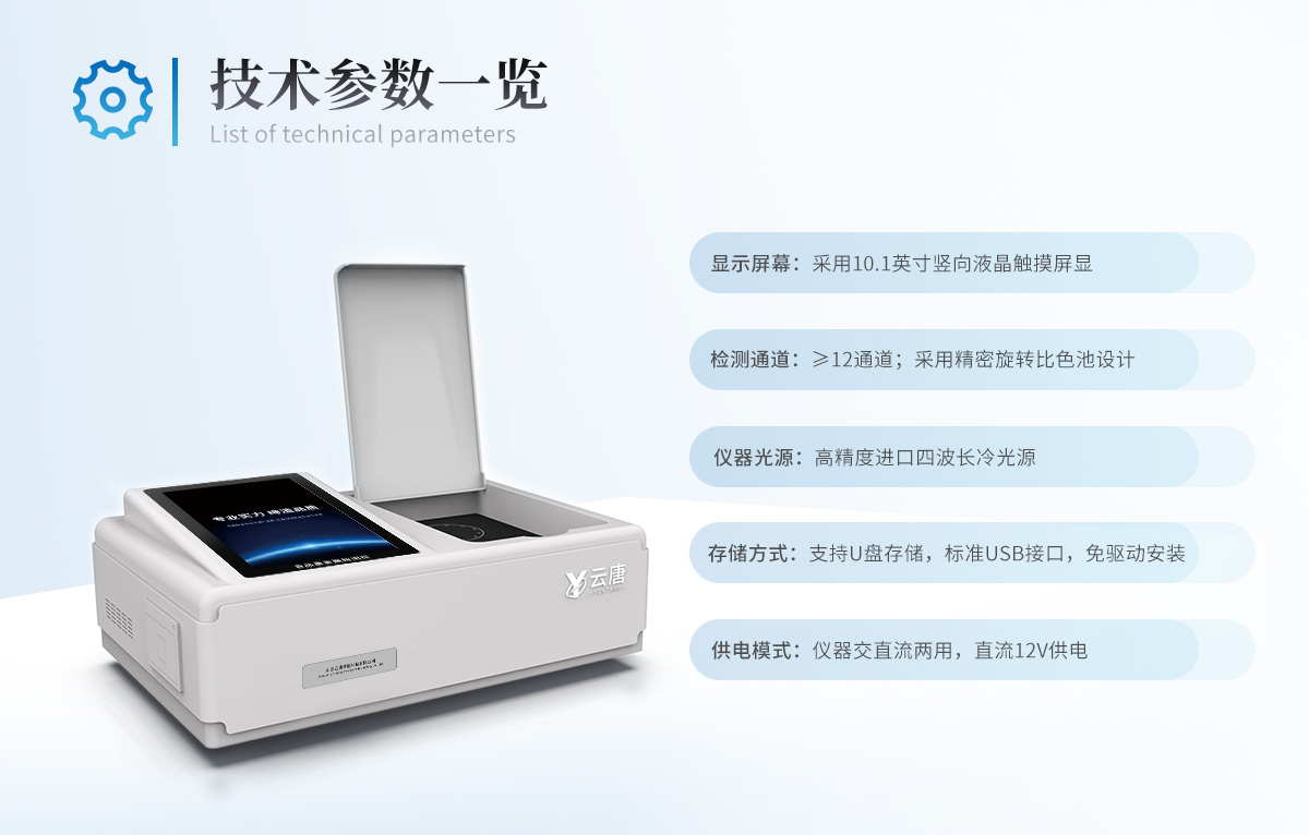 | 儀器采用臺(tái)式一體化系統(tǒng)檢測(cè)技術(shù),將分光光度模塊、新型農(nóng)殘檢測(cè)模塊、數(shù)字化管理模塊、無(wú)線通訊模塊高度集成于一體,支持檢測(cè)200種食品安全檢測(cè)項(xiàng)目,同時(shí)預(yù)留升級(jí)檢測(cè)方法。 | 儀器檢測(cè)模塊標(biāo)準(zhǔn)化、智能化,可隨意自由組合。檢測(cè)箱體內(nèi)置多個(gè)標(biāo)準(zhǔn)檢測(cè)單元,檢測(cè)模塊可以調(diào)整配置。 | 儀器采用全新安卓智能系統(tǒng),主控芯片采用 ARM Cortex-A7,RK3288/4核處理器,10.1寸高清液晶觸摸豎屏,更加**的UI交互界面,運(yùn)轉(zhuǎn)快捷;儀器配備無(wú)線通信模塊: 4G(APN)通訊模塊、Wifi模塊,藍(lán)牙傳輸,同時(shí)具有雙USB接口以及RJ45接口能以多種方式實(shí)現(xiàn)數(shù)據(jù)保存和數(shù)據(jù)傳輸功能。 | 創(chuàng)新檢測(cè)模式: | ★檢測(cè)通道:≥12通道;采用精密旋轉(zhuǎn)比色池設(shè)計(jì),使用同芯片同光源校準(zhǔn)精度,解決不同光源之間的誤差值。1-12通道間誤差0.1%。(**號(hào):**202022821055.2) | ★儀器具有自動(dòng)識(shí)別比色皿檢測(cè)功能,即:將樣品比色皿放入儀器后,點(diǎn)擊樣品檢測(cè),儀器自動(dòng)識(shí)別比色皿進(jìn)行通道檢測(cè)。 | 進(jìn)口高精光源: | 高精度進(jìn)口四波長(zhǎng)冷光源,通道配置 410、520、590、630nm 波長(zhǎng)光源,一個(gè)光源芯片驅(qū)動(dòng)一個(gè)光源,誤差極小,每臺(tái)設(shè)備單獨(dú)**校準(zhǔn)光源,**比對(duì),同時(shí)參照四種不同波段光源全方位覆蓋市面上99%的農(nóng)殘食品項(xiàng)目檢測(cè)。 | 智能化操作系統(tǒng): | 便捷操作系統(tǒng):設(shè)備檢測(cè)時(shí)可在同一檢測(cè)界面自動(dòng)對(duì)應(yīng)相關(guān)檢測(cè)通道一次性選擇1-12個(gè)樣品名稱,無(wú)須退出界面,節(jié)省操作時(shí)間。 | 數(shù)據(jù)集成系統(tǒng):設(shè)備首頁(yè)自動(dòng)統(tǒng)計(jì)檢測(cè)數(shù)據(jù)包含:周檢測(cè)數(shù)據(jù)、月檢測(cè)數(shù)據(jù),全部檢測(cè)總數(shù)量,均包含檢測(cè)總數(shù),合格數(shù),不合格數(shù),以及相關(guān)柱形分析圖,對(duì)各項(xiàng)檢測(cè)數(shù)據(jù)清晰掌握,無(wú)需電腦查詢,更加快捷直觀。 | 項(xiàng)目預(yù)設(shè)系統(tǒng):支持添加單個(gè)及多個(gè)相同或不相同的任務(wù)預(yù)設(shè),一鍵快速調(diào)取,每一個(gè)任務(wù)分別可以設(shè)置不同的樣品、批次、編號(hào)、來(lái)源、備注、抽樣信息、檢測(cè)信息、受檢信息、復(fù)核信息等更多信息。無(wú)縫鏈接平臺(tái)和APP實(shí)時(shí)查看下發(fā)任務(wù)。 | 數(shù)據(jù)監(jiān)管系統(tǒng):同步對(duì)接監(jiān)管平臺(tái),數(shù)據(jù)可局域網(wǎng)和互聯(lián)網(wǎng)數(shù)據(jù)上傳,檢測(cè)結(jié)果可選擇直接傳至食品安全監(jiān)管平臺(tái)。集成OSS輸出存儲(chǔ)服務(wù)、區(qū)分設(shè)備定向管理應(yīng)用,進(jìn)行區(qū)域食品安全監(jiān)管及大數(shù)據(jù)分析處理與數(shù)據(jù)統(tǒng)計(jì),檢測(cè)區(qū)域食品安全長(zhǎng)短期動(dòng)態(tài),達(dá)到食品安全問(wèn)題預(yù)估、預(yù)警。 | 自定義打印系統(tǒng):內(nèi)置全新打印系統(tǒng),新創(chuàng)自定義打印方式,可按需靈活設(shè)置開(kāi)啟或關(guān)閉:產(chǎn)品合格證(國(guó)家農(nóng)業(yè)部標(biāo)準(zhǔn)要求),二維碼,抽樣信息、檢測(cè)信息,受檢信息、復(fù)核信息、抽樣日期、檢測(cè)日期等信息的打印。 | 系統(tǒng)遠(yuǎn)程更新功能:可定向分客戶分儀器更新系統(tǒng),按照不同客戶后期實(shí)際需求添加項(xiàng)目,無(wú)需機(jī)器返廠,即可遠(yuǎn)程實(shí)時(shí)升級(jí)全新系統(tǒng),節(jié)省時(shí)間成本及避免運(yùn)輸造成設(shè)備損壞。 | 儀器主機(jī)采用一體化防水、抗壓、防撞擊、防腐蝕箱體設(shè)計(jì),同時(shí)配備交直流供電,可連接車載電源,可選配大容量充電鋰電池,滿足現(xiàn)場(chǎng)野外檢測(cè)需求。 | 安全證書(shū),放心保障:儀器具有中國(guó)計(jì)量科學(xué)研究院校準(zhǔn)證書(shū),權(quán)威認(rèn)證。 |