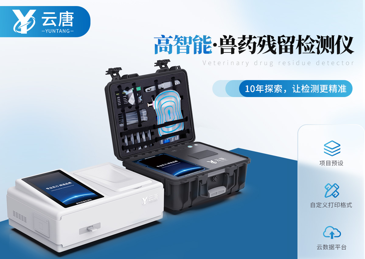山東云唐智能科技有限公司生產的獸藥殘留檢測儀可快速檢測瘦肉精激素類食品安全項目,包含鹽酸克倫特羅、沙丁胺醇、萊克多巴胺、己烯雌酚,獸藥殘留、抗生素類殘留、真菌毒素類殘留、動物疫病類等檢測。