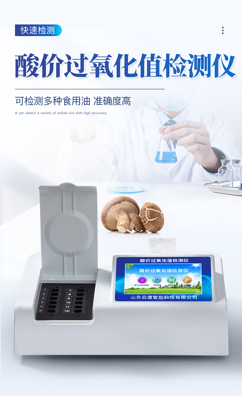 食用油過氧化值檢測儀為集成化油品快速檢測分析設備,能夠快速檢測食用植物油、食用豬油、花生油、葵花油、米糠油、食品、肉制品中的過氧化值含量;通過檢測可確定植物油是否符合國家標準或是否為劣質油、地溝油等。儀器預留其他項目檢測程序和端口,根據日后需求可方便的自主增加檢測項目。日后可升級為檢測水產品、面制品的綜合類型儀器。