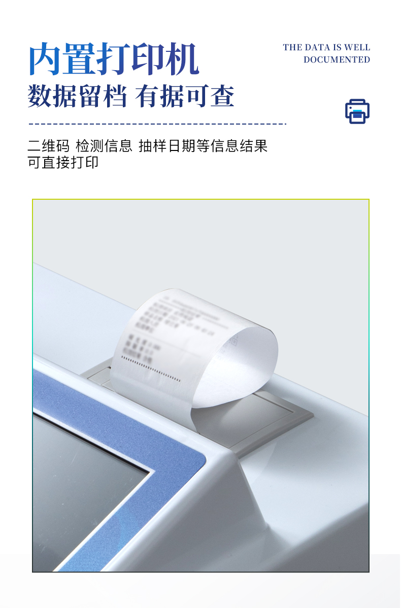 | 安卓智能操作系統,采用更加**和人性化操作,儀器具有網線連接、wifi聯網上傳、GPRS無線遠傳功能,快速上傳數據。 | 一體化便攜式快檢設備,滿足現場及流動檢測使用需求,能夠在同一軟件下實現所有檢測項目的檢測,并可通過同一窗口直觀顯示檢測結果。 | 智能化程度高,儀器具有自檢功能:具有開機自檢和調零功能,具有自動檢測重復性功能。 | 檢測通道:≥12個檢測通道,可以同時測試多個樣品,每個樣品由程序控制分別獨立工作,不會互相干擾。 | 顯示方式:≥8英寸液晶觸摸屏顯示,人性化中文操作界面,讀數直觀、簡單。 | 配備新一代嵌入式熱敏打印機,可選擇手動打印或者自動打印,檢測完成可自動打印檢測報告和二維碼。 | 光源采用進口超高亮發光二極管,高精度、穩定性強、光源可控、可以關掉不使用的光源,功耗更低。 | 采用USB2.0接口設計,方便數據的存貯和移動,并可隨時與計算機直接相連,并且可用計算機控制儀器。實現數據查詢、瀏覽、分析、統計、打印等。 | 儀器具有品類多種類樣品菜單庫,可靈活選擇檢測樣品,不同的檢測通道可同時檢測不同的樣品項目。 | 樣品處理簡單省力,整體操作快速、安全、便捷。 | 儀器具有自身保護功能,可設置用戶名及密碼,防止非工作人員操作等。 | 高靈敏度,高檢測精度,高重復性精度,掃描式高精度光學傳感器。 | 過氧化值檢測儀器具有重新校準、鎖定、恢復出廠設置功能。 | 結果判定線可修改,對照值標定值可保存,斷電不丟失數據。 |