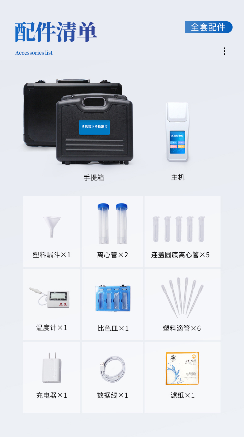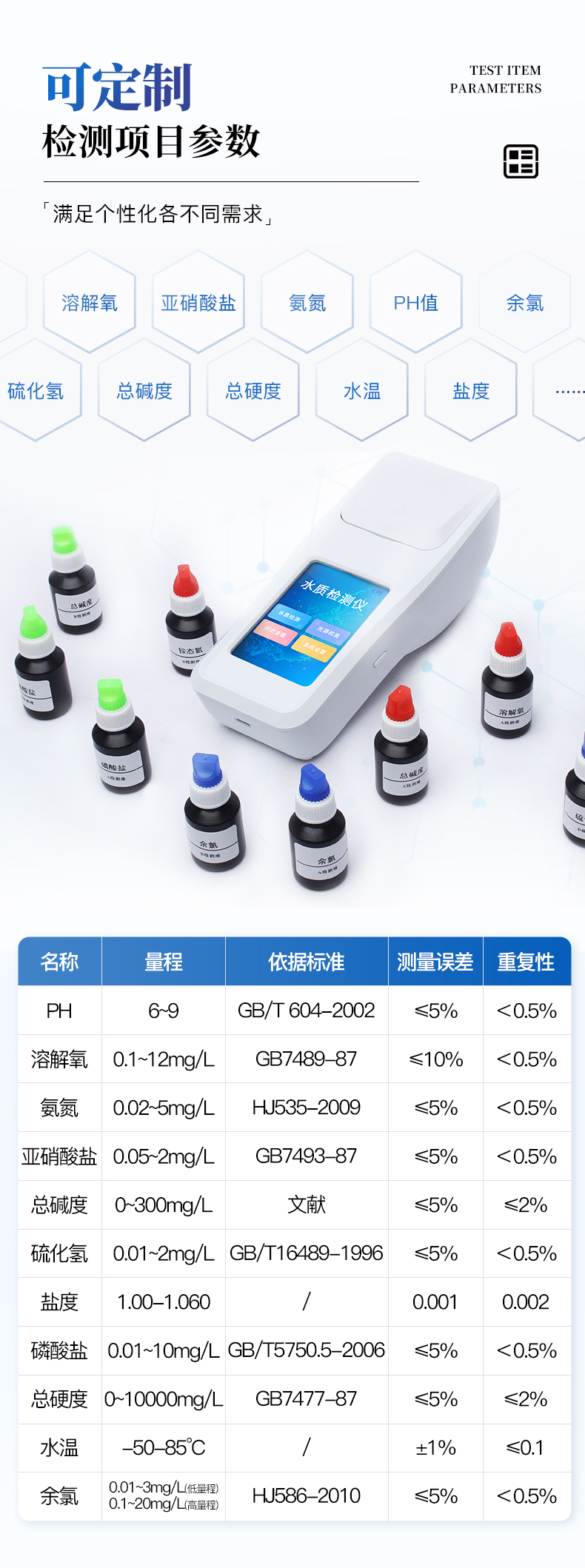 余氯、總氯、有效氯、氨氮、溶解氧、pH、濁度、懸浮物、二氧化氯、臭氧、尿素、色度、氯化物、氰尿酸、硫化氫、亞硝酸鹽、磷酸鹽、總硬度、總堿度、水溫、鹽度等20多種檢測(cè)指標(biāo)任選11項(xiàng);