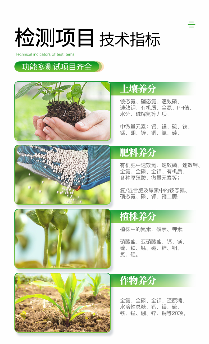 土壤:水分、pH、含鹽量、銨態氮、有效磷、速效鉀、有機質、堿解氮、硝態氮、全氮、全磷、全鉀、有效鈣、有效鎂、有效硫、有效鐵、有效錳、有效硼、有效鋅、有效銅、有效氯、有效硅;