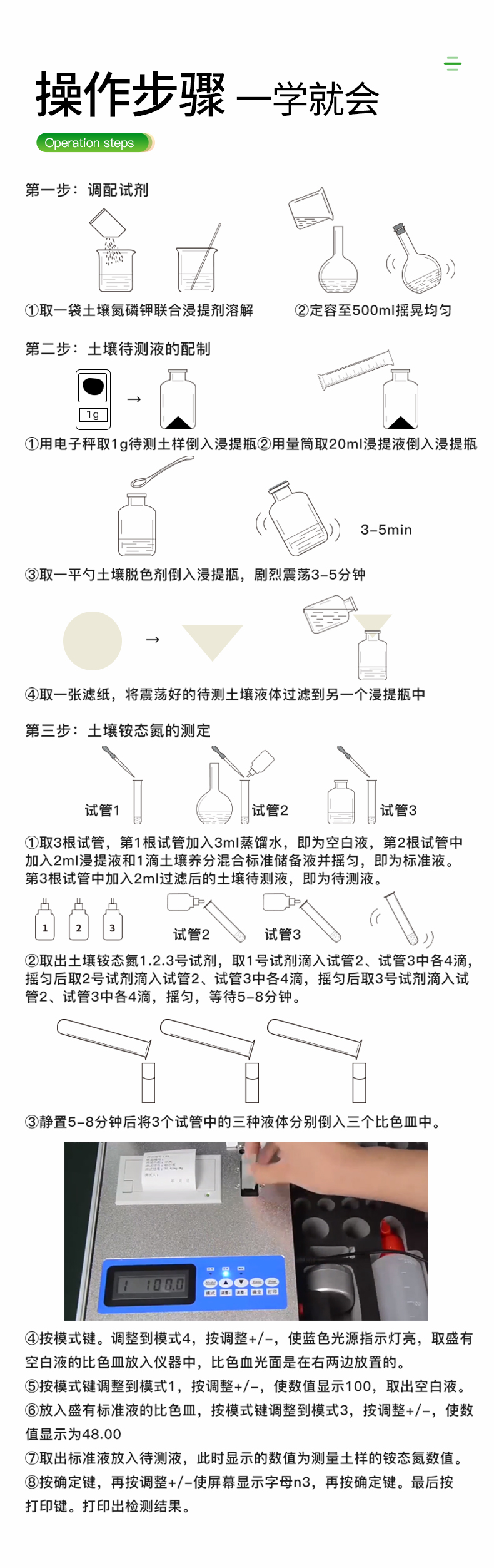 測試一個肥料樣(N、P、K)≤40分鐘,同時檢測三個肥料樣品(N、P、K)≤1小時。