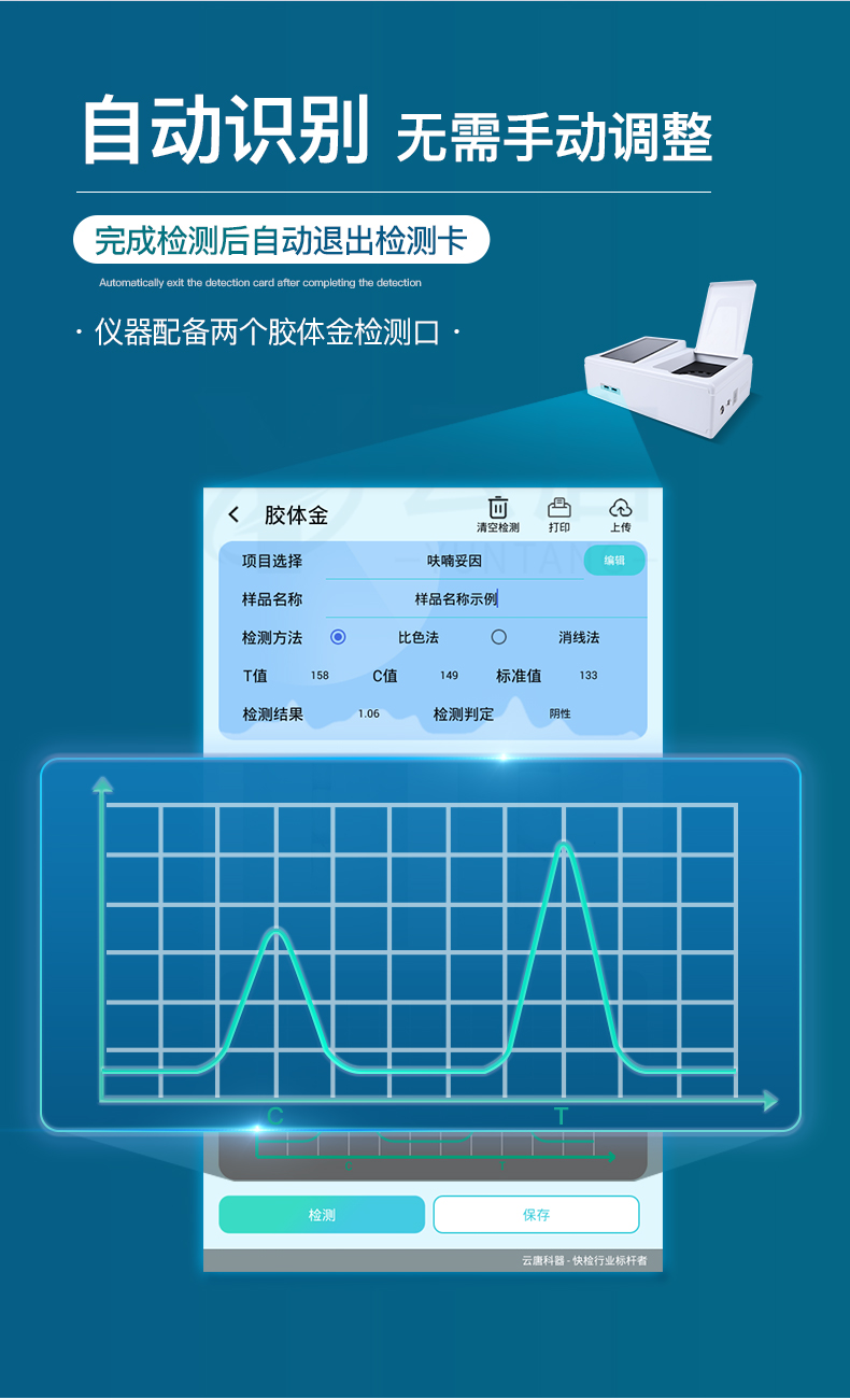 ★采用COMS實時成像技術,可采集多個畫面,支持2個金標同時讀卡,通過不同顏色的灰度變化,一秒精準得出結果。