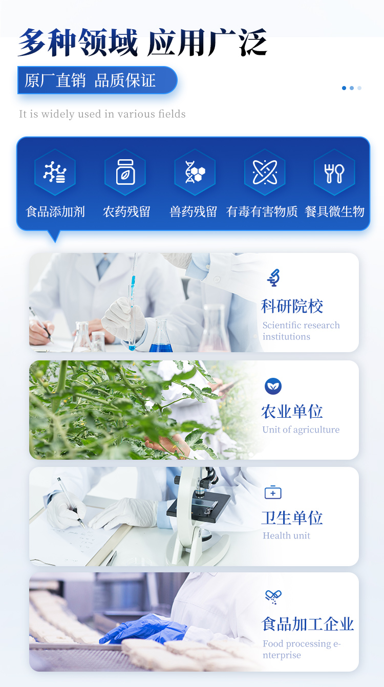 該高智能食品安全檢測儀為集成化食品安全快速檢測分析設備,目前已于食藥監局、衛生部門、高教院校、科研院所、農業部門、養殖場、屠宰場、食品肉產品深加工企業及檢驗檢疫部門等單位廣泛使用。