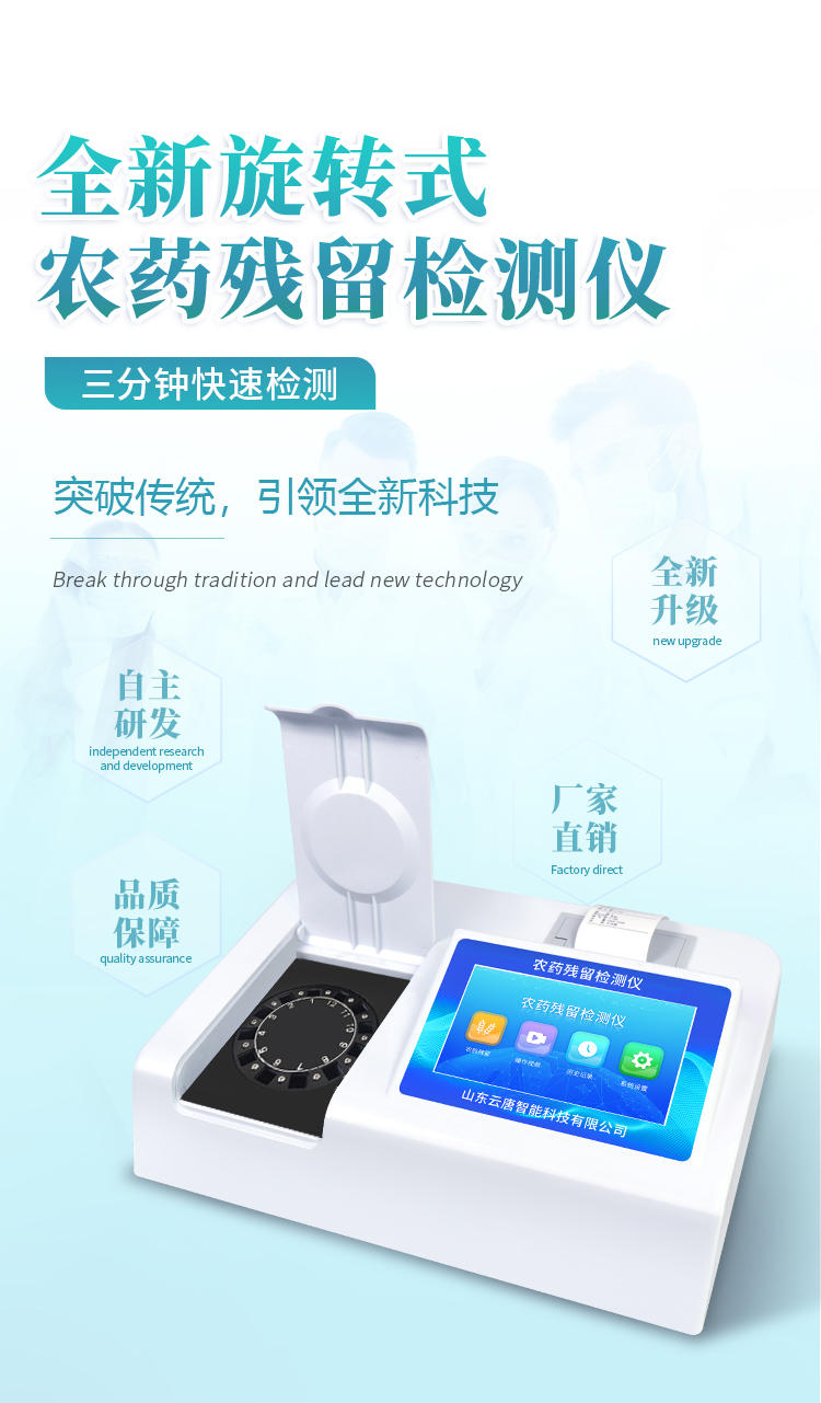 山東云唐智能科技有限公司生產(chǎn)的農(nóng)藥殘留檢測儀廣泛應用于主要用于蔬菜、水果、茶葉、糧食、農(nóng)副產(chǎn)品等食品中農(nóng)藥殘留的快速檢測,依據(jù)國標GB/T5009.199-2003進行檢測,適用于果蔬茶生產(chǎn)基地以及農(nóng)貿(mào)批發(fā)銷售市場現(xiàn)場檢測,餐館、學校、食堂、家庭果蔬加工前的安全速測等。